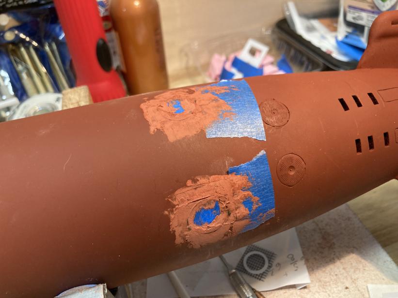 The green covers my first attempt at scribing the retractable cleats. I wasn't satisfied with my first try so I gouged out the work with my Dremel and filled in with Evercoat Body Filler.