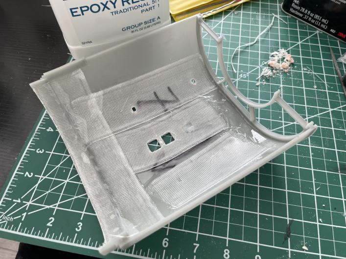 Secondly I took a section of hull that was a discarded print and tried some quick fibreglassing on it. Not pretty, but it validated my approach of stuffing modeling clay (Sculpy actually) in the holes in the hull to block them out sufficiently so that the resin didnt fill them up and make them impossible to reopen. Also, this was a shot at trying a slower cure resin than I've used previously on my sci-fi helmets (Bondo brand) with a different matting that I think I like better. Will try another test later today with the "old" stuff. I must say that the hull survived many drop tests even with this small, incomplete reinforcement which bare sections failed in an epic fashion.