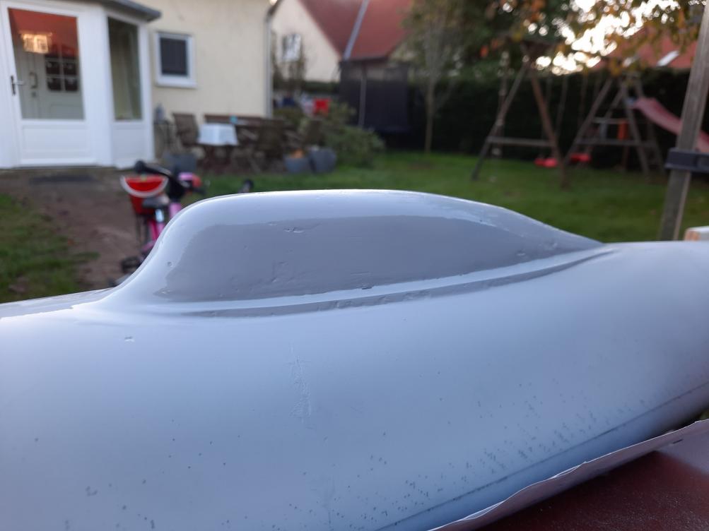 Seriously, the upper hull was roughenend up using 1200' grit and then washed with alcohol. Afterwards, grey primer was sprayed on so i can finally see what i am doing. And blame me, the sail is still wrong!