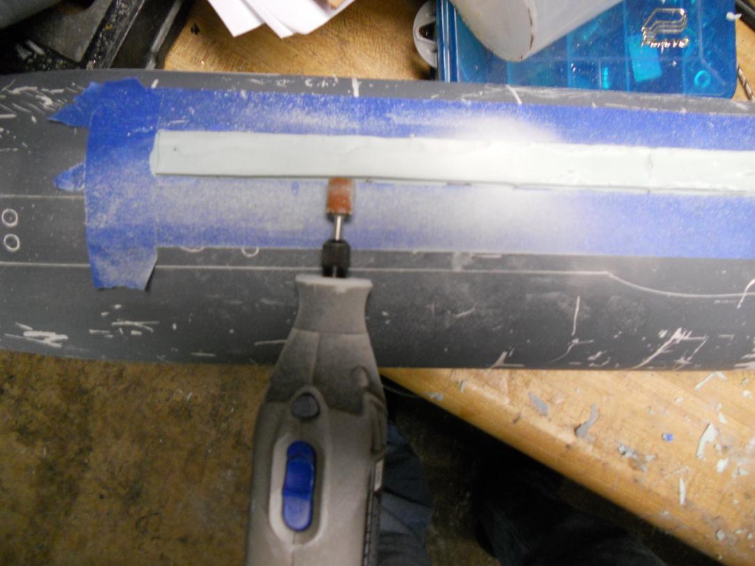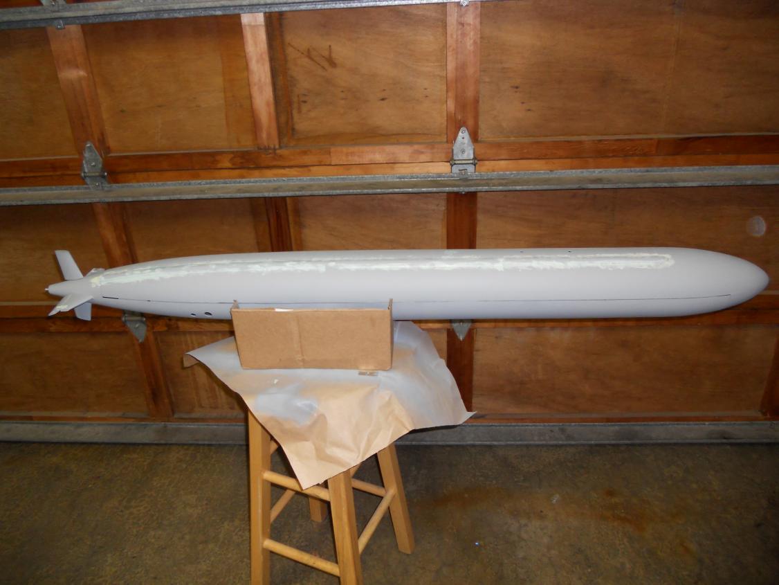 Here is another set. I am working on the towed array storage fairing still. Used cheerio cardboard box cuttings superglued to the hull to model the shape of the fairing. Kind of a bother to sand it all, cause the bondo filled the trough flat, even though I was in there with a putty knife trying to contour it, so I used a dremel to speed up the process. Still filling little things here and there on it, but it is actually starting to resemble a towed array fairing now.