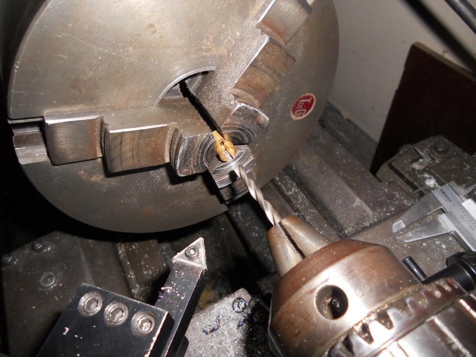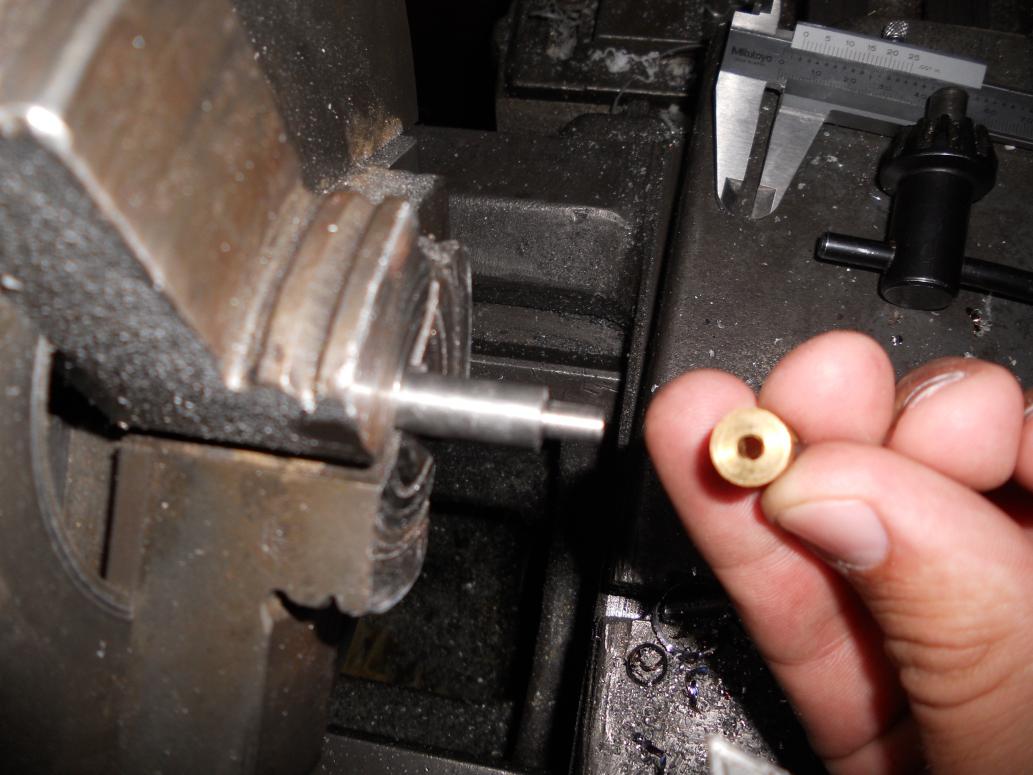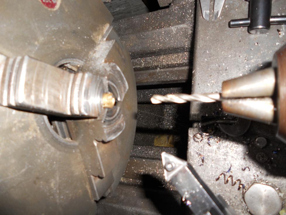I'm working on the tailshaft again. This time, I'm adjusting the size of the Dumas brass shaft coupler by drilling the center of it out, and necking the shaft down so that the two will fit together reasonably tightly.