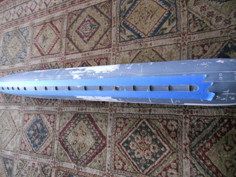 Photos of the towed sonar array fairing. Having to build up the fairing was a pain, just to ensure that there were no irregularities in the shape of the fairing down the hull. I was also filling the cracks in the edges of the fairing. Still working on the shape of that.