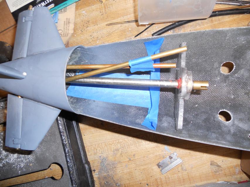 Also, you can see that I added a stainless steel washer between the tailshaft and the Dumas coupler. The reason for this is so that when I throw the boat into a crash astern, the tailshaft actually has something to 'pull' against, so that it doesnt go spinning out of the back of the boat. It will be pushing against the brass/bronze oilite bearing that is visible in the clear plexiglass. These items have not yet been secured into the stern of the boat, but that should happen later tonight.