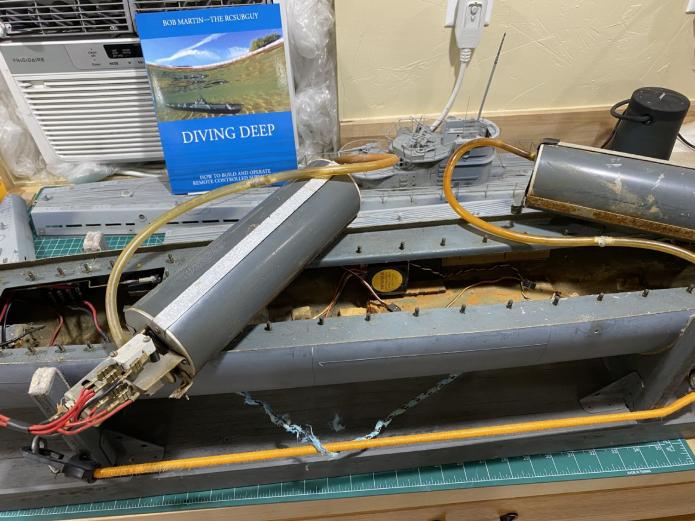 Got this about 15 years ago and it needed some TLC. Hull was warped, so last summer I set it outside and let the sun do it's work. I previously had put brass 'stiffening' brackets on the side in order to assist getting it back together. About a month ago I had a big shock, as I was watching the old Sub-regattas in New London, this one being the 1993 (part 1). So I'm marveling at the Ray Mason Nautilus, I guess that's when Ray introduced it as he won 3 awards for it, but what I was shocked about was this guy carrying my U-Boat, and it's seen about 5 times in the video, and Ray's narrating and names the guy who owns it, and it's Charley Cleveland. This is funny as I knew the previous owner before whom I got it from and he had said it was built by someone else. I was talking to Bob M. via e-mail and described this sub and he said it sounds like an Engle, and all the photos I'd seen of Engle's they didn't have torpedo tube shutters, a better 105mm, and the internals looked better. So this last weekend I had some down-time from Nautilus and dug into it, rather excavated it. The crap in the bottom looked like the bottom of a lake. Took out a time of lead, sinkers, and other odd bits, then got the ballast cylinders out. I told Merriman about it and he said 'gut that crap, and put a 3.5" WTC in it'. So proceeding forth. Gave it two baths with Simple Green, and the interior looks better than the deck now. After taking the ballas cylinders out, I took one apart and after some clean up, and replacing the 540 motors, it will be good to go to a new home. I'm not a fan of dry-hull at all though. This sucker weighed a ton, and it didn't even have water in it.