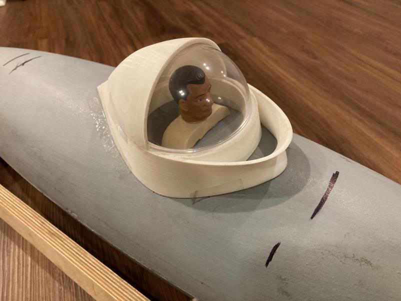 The pilot figure and the hemisphere are now permanently mounted. He has real fabric for his jacket and there are some small details inside.