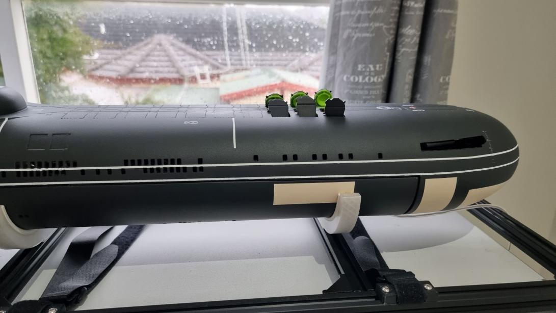 The 3D Typhoon printed in PETG, with a Nautilus V2 cylinder, with the addition of bow plane hatches, twin sets of scopes, bow thrusters, and sequential opening missile hatches. Fortunately Bob talked me out of the thrusters early, because although I had assumed the Typhoon would have room to spare, once the cylinder went in there was no space for a thruster.