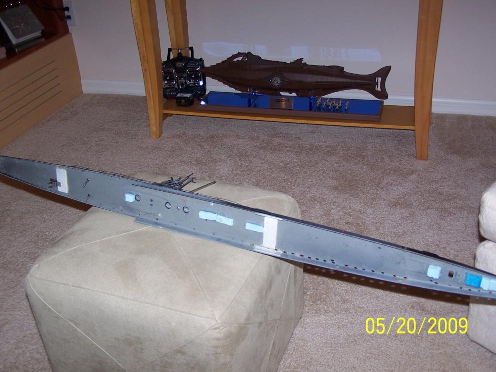 Yeah, the ballast-weights should only be located directly over keel (in center of hull), then the holes are drilled each side of weights. A few smaller holes directly in center for drain holes is okay, if there are pockets between and at ends of lead-bars, but not really needed for proper operation. Those would be drilled after installing the weights, tho.