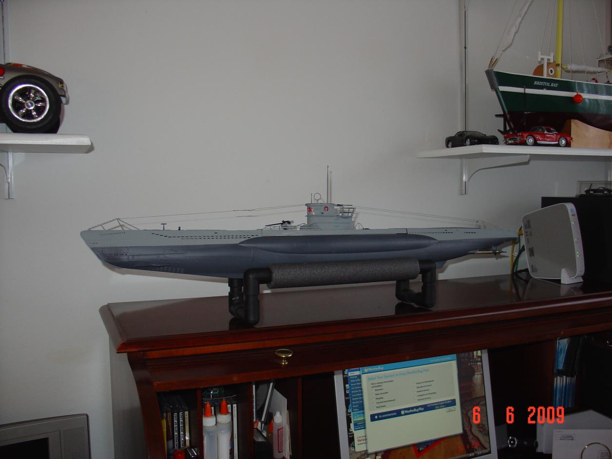 That works for me. Have boat will travel. I think I'm getting close on the type VII. Caswell is sending my Gato stuff. Should be here 6/8 and 6/10. I will be short the assembled Gato S/D. but that's OK I've got lots to do. There's the unknown which always has it's way with me. This is a real kick in the butt. Lots of fun. Also working on a travel box for the type VII. Working on the rubbers today. I've got to go to Gulfport MS. for some material. Rudders should be done today. Picture of VII attached. Going to do a little repainting.