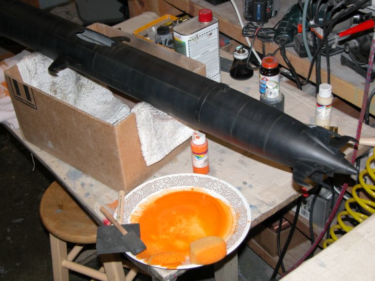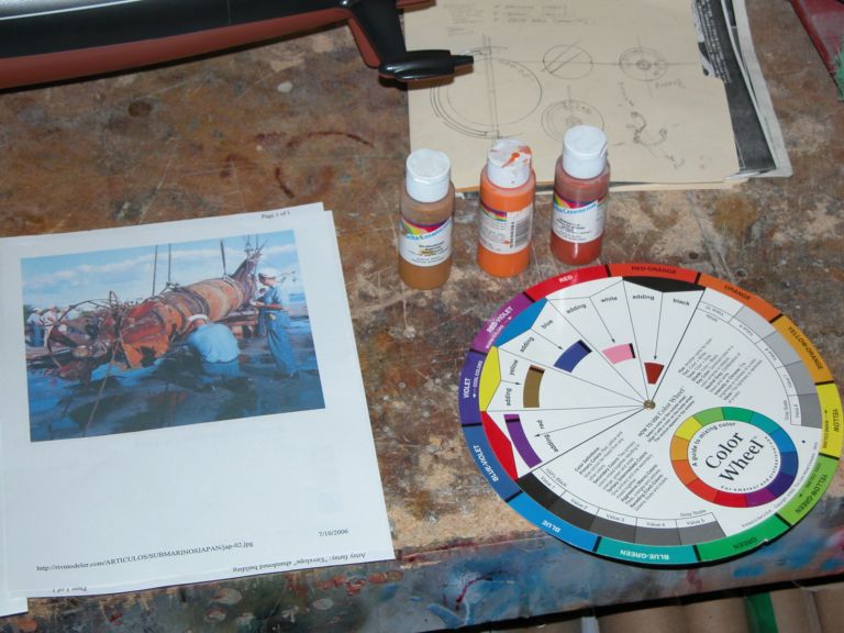 good morning pj,i have found two ways to make rust . the first is to take some steel wool,chop it up add a little salt water the rusty water will stick to the sub.the second way is water based flat paint,orange and brown.you live in south louisiana so you know what rust looks like. just keep adding orange and brown to get the desired rust color you want. just remember you can always add more but you can't take it away.if you would like large pics let me know your email address and i will send you close up shots of gato.good luck and don't forget i am here for any questions you may have.