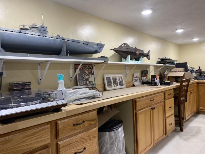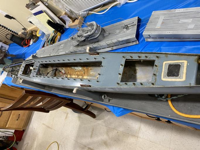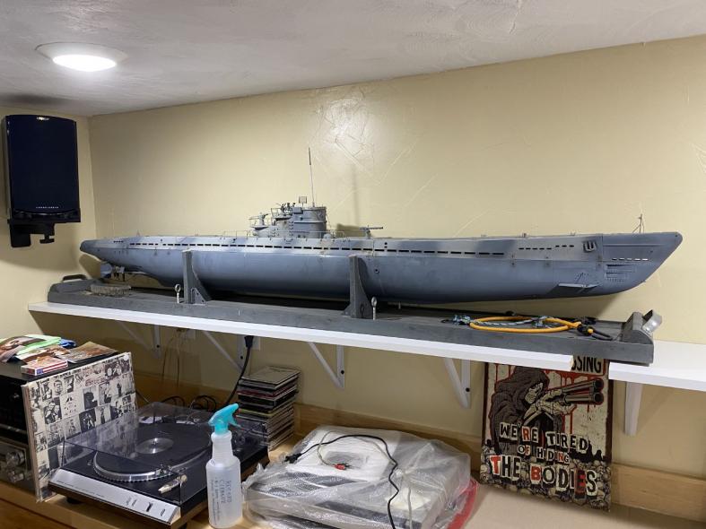 Steve, glad your sub finally made it. Had a blast talking with you at Subfest. I have Nautilus getting a refit and have my Engels Type IX getting ready to start. So mine is a IX/40C and it's 77" long, now that would make it...1/39 scale. The Engels IX D2 is 77" long and it's 1/45 scale...? Sounds too funny when I think the hulls are pretty much the same. The D2 was about 30' longer in real life. So it's a head-scratcher. Looking at yours, mine undoubtedly came out later, and it's a late 80's boat. If you watch the 1993 Sub-Commitee regatta on Youtube, it's all over the video with the original owner (Charlie Cleveland). I've got to re-do a lot of the brass, take off the inaccurate 105mm (they didn't use them after 43' anyway), and probably have to lay some new glass to strengthen the upper deck. Some other little things. Inside, I've taken everything out, and going to cut a lot of the bulkheads out, heave the old motors and redo the rudder and planes controls, then put a WTC in it. Sucker's a hog to carry around, especially when it had all the lead Engels put in it to counter the dry space. Anyway, here's some photos. I put some pictures of my newly cleaned shop for historical reasons. It got trashed when working Nautilus and a few other projects. All my hobbies are out there now except for my classic cars...so it gets trashed a lot. Relented and had to put some shelves up too.