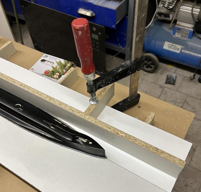 Then I set up the parting plane and filled the gap between board an boat with camdle wax...