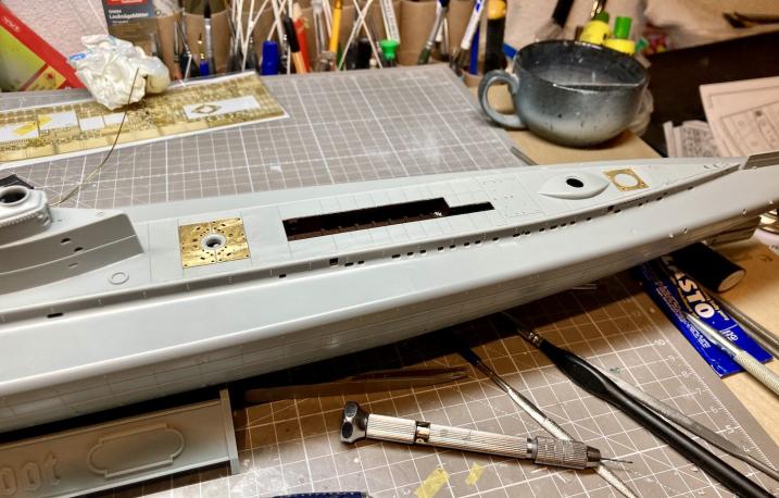 Before the installation of the deck, I improved the hold for the exhaust mast. It's already a nice part that shows the upper side of the pressure hull, but of course it was not closed but open to deck superstructure. RC Subs offers a replacement, but I took the dimensions of the original part, designed extensions and printed them. They were then glued to the left and right of the styrene part using superglue and then the styrene between the struts was drilled and filed away, Voila, an open structure with a bit more of the pressure hull.