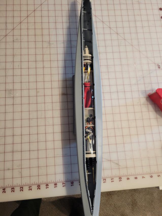 I also spent some time with measurements and such on the Das Werk kit. Since there have been questions on the kit and an RC modified version I'll put these out. There is room to put in a WTC. A 50 mm x 300 mm WTC just fits. These are photos with my RC build hull.