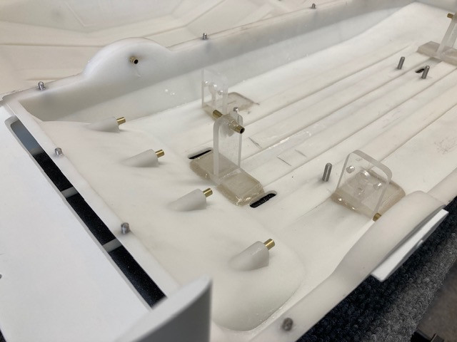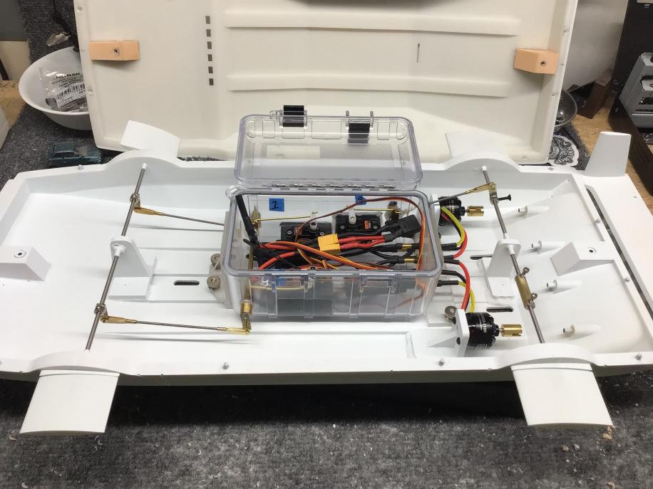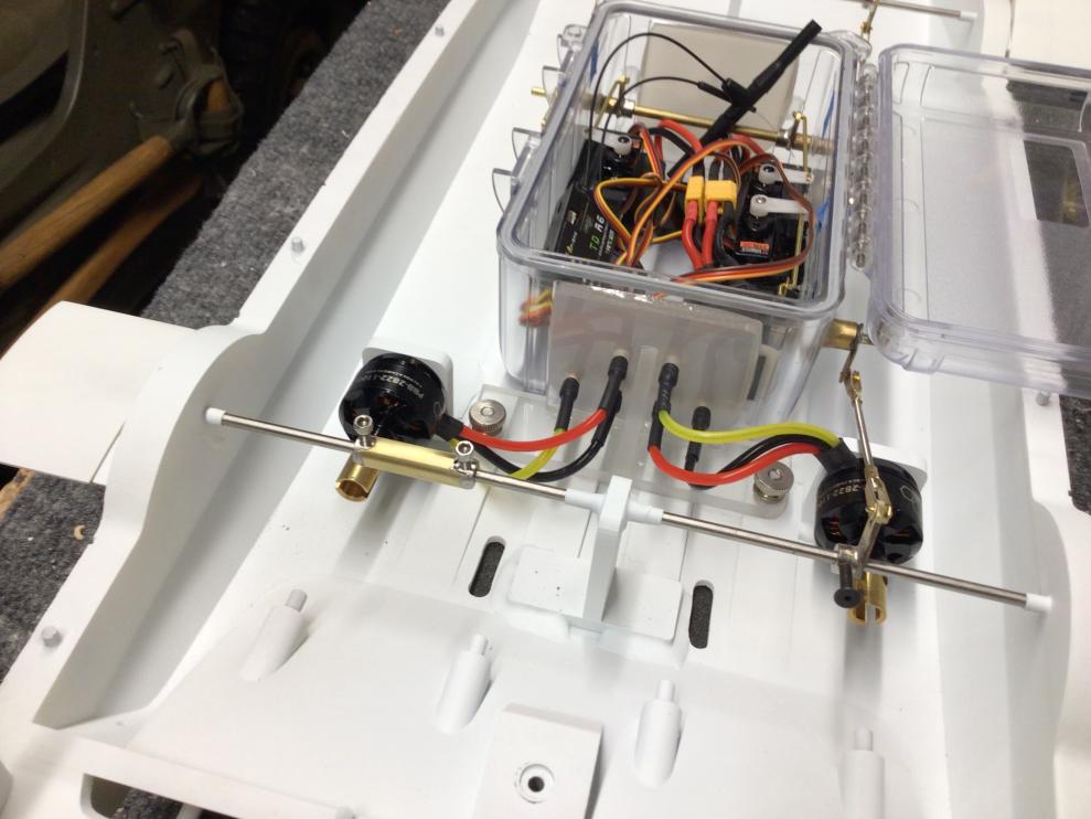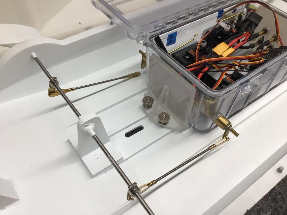 Linkages are complete! I also built the hatch hold down mechanics using some brass threaded inserts front and rear with 4/40 hardware. The last task is to test propellers and set up the transmitter. I did get the X18 channels all mixed but need some help on limiting the throttle travel when turning. If anyone has experience, please PM me.