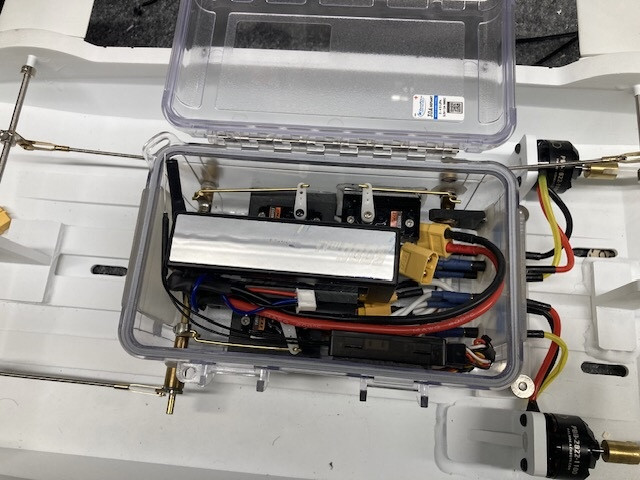 Final tub float test. I have 1/8” of roof above the water for a good starting trim. Using Velcro in the corners to do the fine tuning. Radio box is complete and I was able to get the 900mhz antenna pretty vertical and the 2.4 at the highest point of the pressure box.