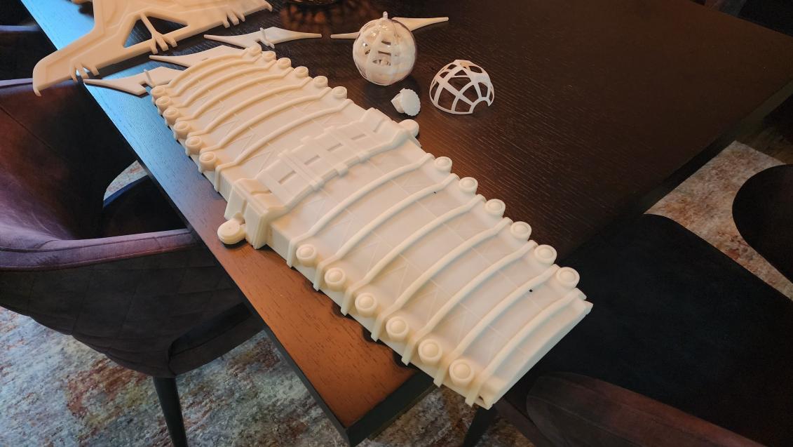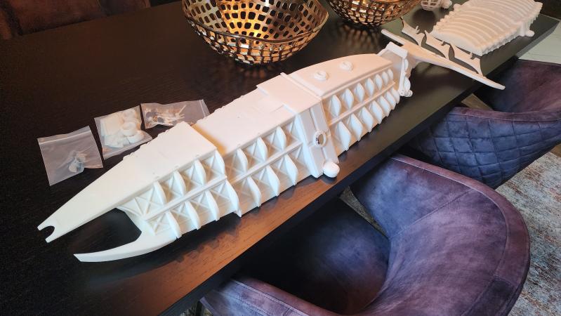Files are freely available on Thingiverse, but needed to be heavily modified for actual printing and functional control surfaces, hull split, etc. Overall length is about 4ft. I fully detailed out the control sphere, and it will be a dry area to help offset the weight of the (rather thick and strong) hull.