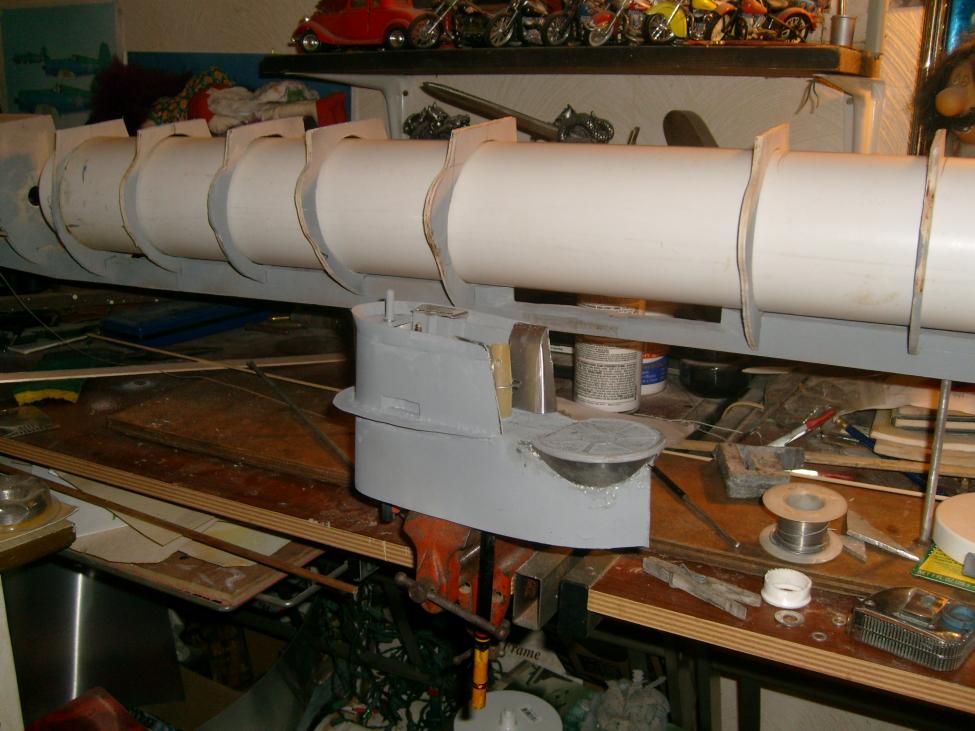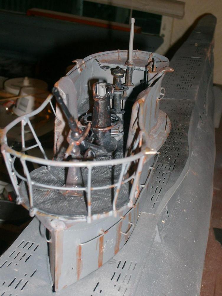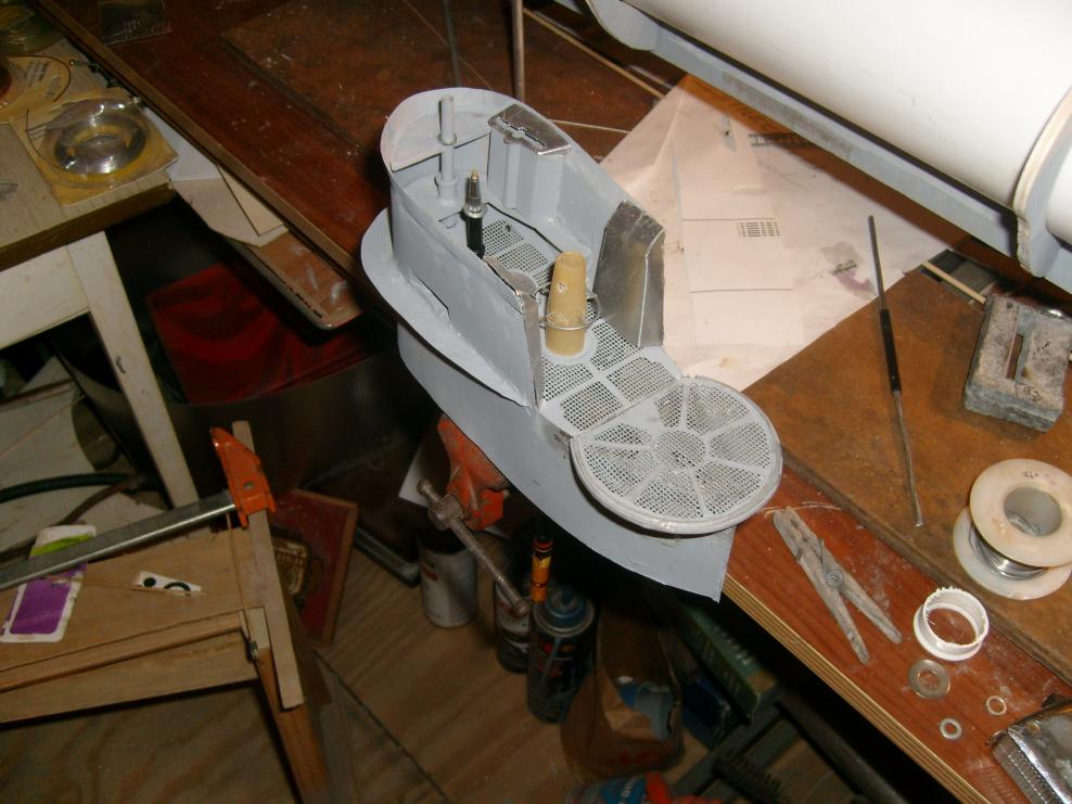 external balast is framed and sheeted with aluminium. They will be filled with styrofoam and sealed. The internal balast air bleed valve for setting the neutral buoyancy is hooked up to the sound antenna in the deck fwd of the winch. Basiclly a needle valve with a piece of plastic sprue epoxyed to the stem at the end of a piece of tubing that vents the main balast. This is so you can pre set how high the boat rides in the water. At this point, my friend, who is the Head of Archiology dept at the Mel Fisher Marine museum, in Key West, stopped by to look at some u boat models for a possible WWII display. When he saw this one he wanted it, so all the work in design for power/controls/driver instalation ect is out the window, and its destined for display. I'll use the money to get one of those new 3" drivers and radio gear for the big 1/24 type II im building, or maby just a driver and equipment for one the 1/72 type VII boats of which I have several of, that could be equipped. Also 1/72 type IXD vacuformed hull, as well. I could get one driver and interchange hulls for the operating experienc while I save up and plan for the big boat. Anyway Ill keep Updating this build as I add detail untill I actually have the money in hand to let it go. As it is, the shafts are in place as well as all the belcranks and rods for dive planes and rudders. All I would have to do is remove a section of rear deck to access the hull for driver instalation. The tower is removable to be able to change the two styles I have built already, So if I end up keeping the boat I can change them out, and may even build a 3rd tower with the extra wintergarden for a flak boat type VII