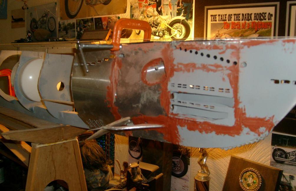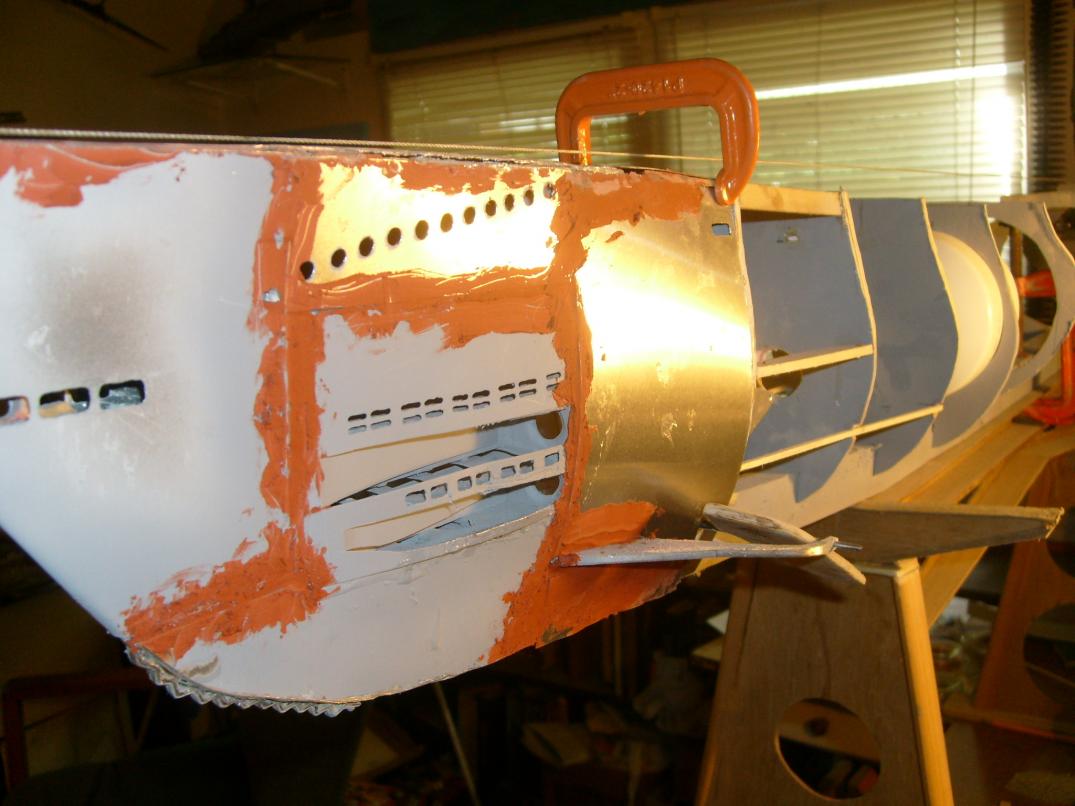 sheeting the hull with aluminium flashing after making construction paper, templates and cutting holes with a dremmel before gluing with epoxy and filling seams with auto body glazing putty