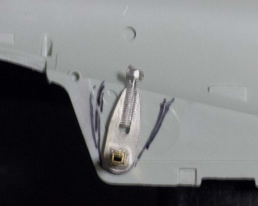 Thin down the plastic shank of the Kli-Con and it will get down in there to follow the head of the stern plane bell-crank. Use #240 is quick little jabs using light pressure, keep a damp rag nearby and use it to keep the plastic near room temperature.