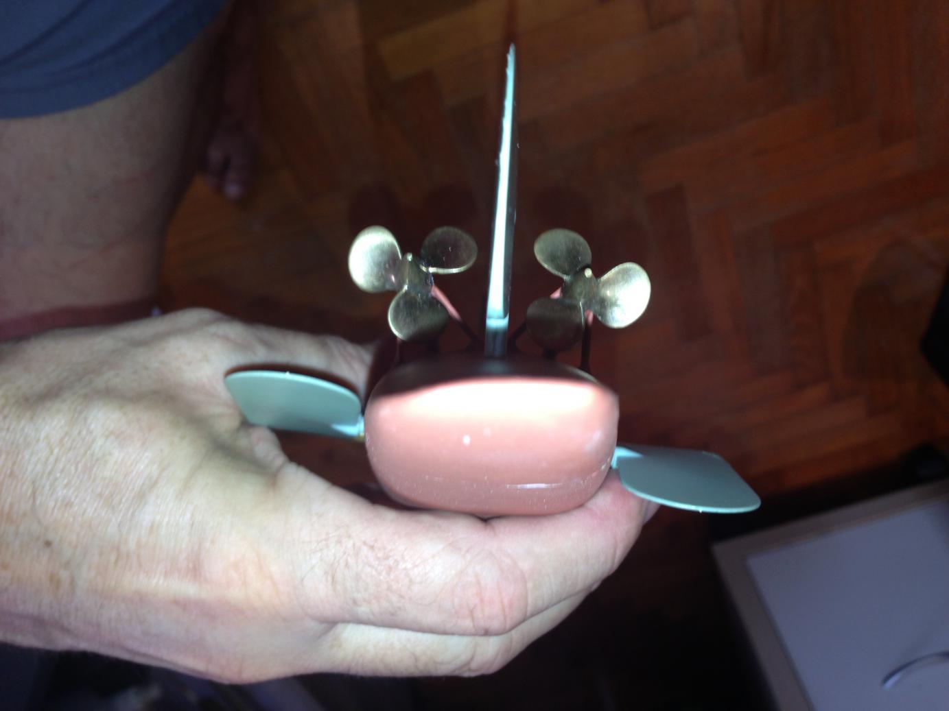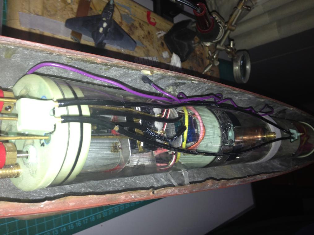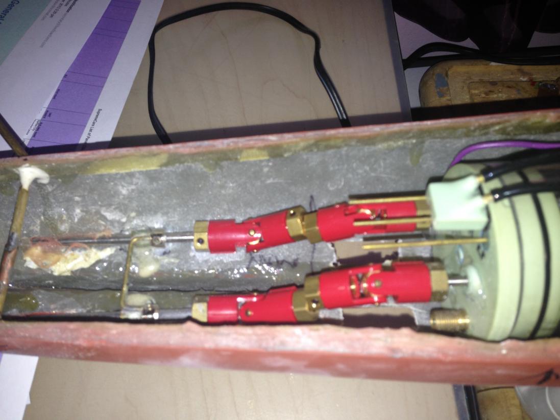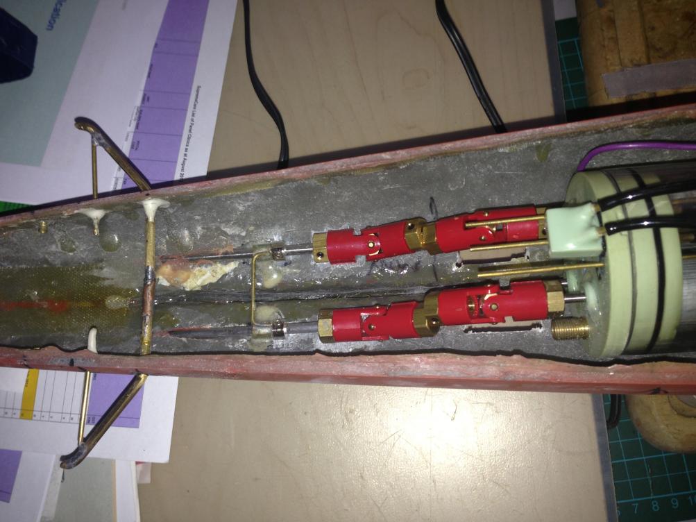 Got the drain holes rough cut, some vents (but need more). Fabricated a hold down for the Sub driver and got the propshafts shortened and couplings roughly in place. Right now this is fitted with a Foxtrot sub driver which has three shafts. The pair of shafts are high up and hence a bit of offset from the prop shafts. Hope its not too noisy. Surprisingly its very tight in there with a 2.5" cylinder. I have the sub driver as low as possible with both ends just clear of the bottom of the hull. The Vent valve and snort manifold sit up inside the narrow part of the superstructure and requires some grinding away of the glass to give clearance. Long term i will get a standard twin shaft 2.5" Sub Driver. Will probably see how the Type IX one pans out or even go with a long 2" (seaview) to avoid the clearance problems and getting a fully submerged ballast tank in surface trim. I remember the issues that Slats had with his O Class, and i think i could have a similar scaled down issue