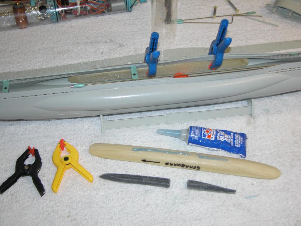 Don't make the lead weight fixed ballast any more complicated than you have to. Cut and hammer to shape enough lead to fit about 2/3 of the available space within the long longitudinal cavity formed by the submarines 'keel' at the bottom of the hull. It's not necessary to make it conformal or pretty. And tac-glue tje lead it in with a little RTV as during the trimming phase you're going to add/remove lead and move it fore and aft.
