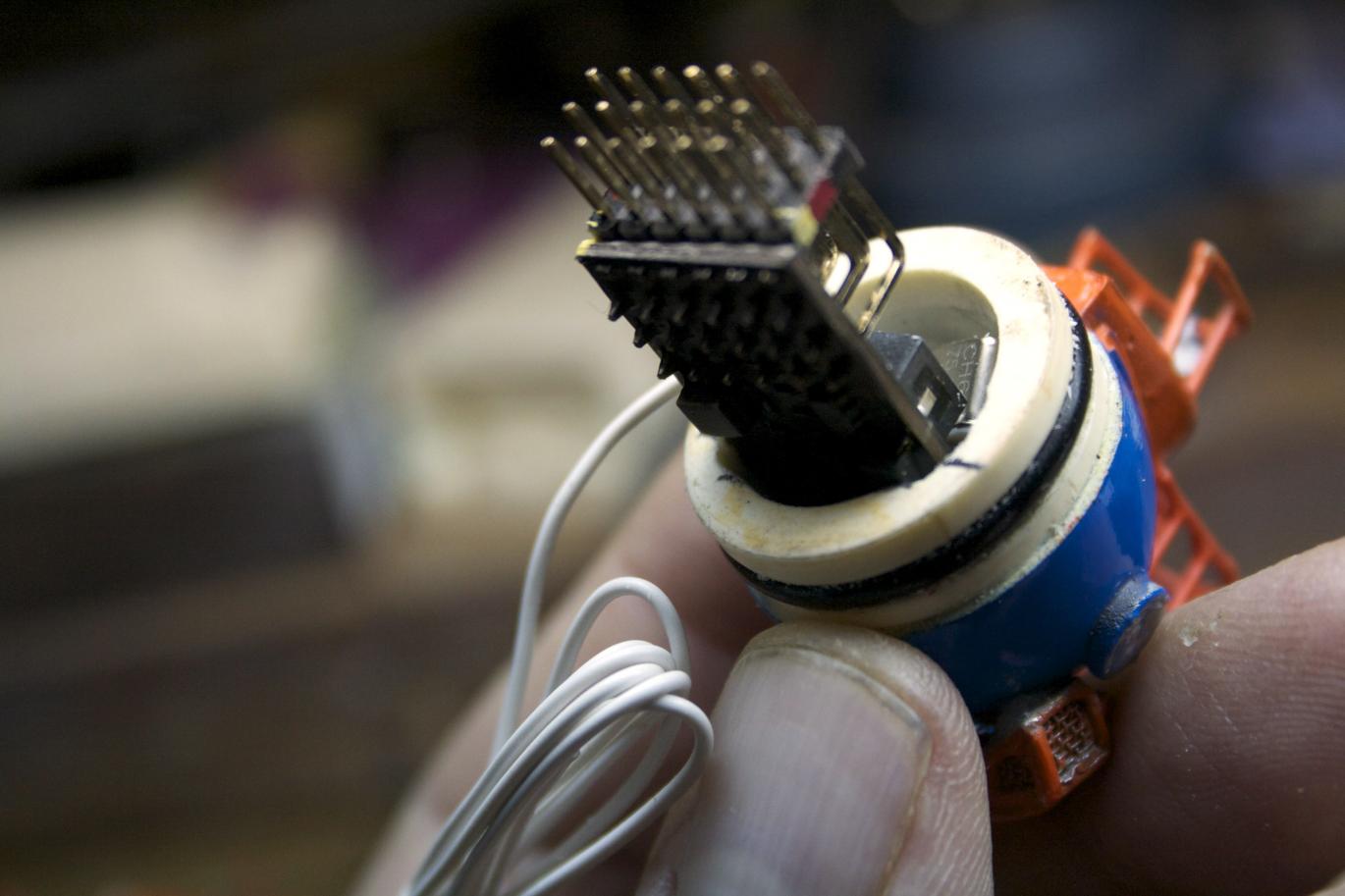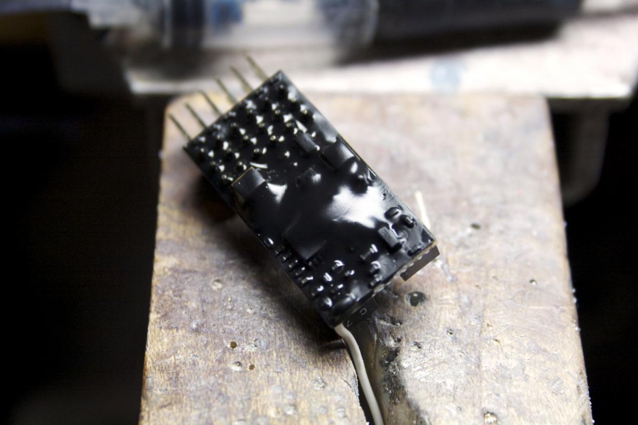Trimmed the female pin way back and solder the harness wire to it. Tried first to solder the side where the original wire went, but the solder and new wire blocked the RX pin from going all the way in. So, soldered again, this time on the back of the female pin.
