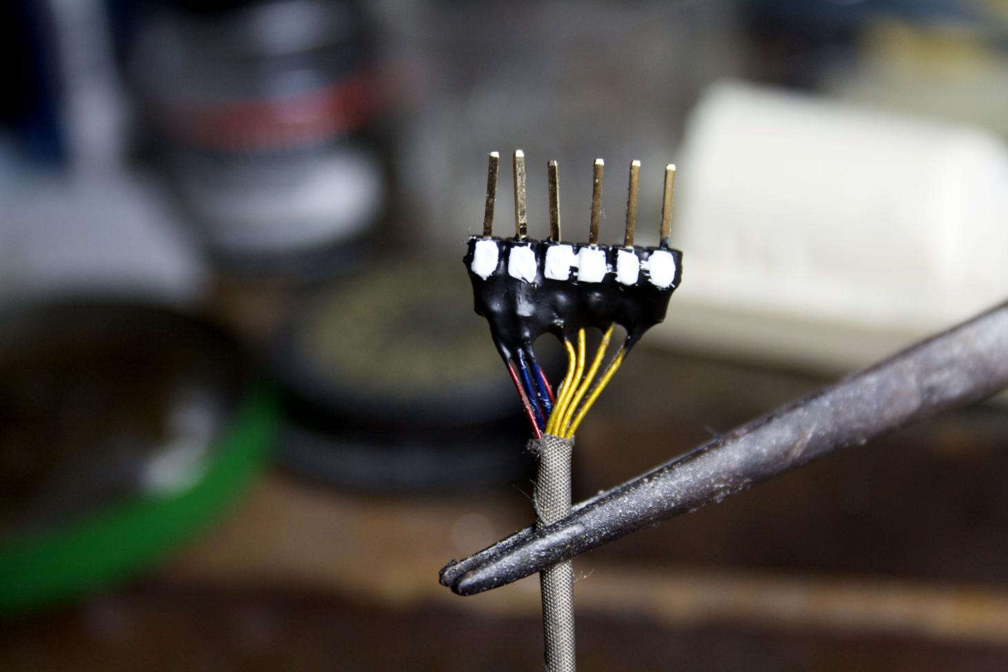 Then began work on the wire harness. Painted white on it to use for marking channel it will belong to. I got it a little too hot so I melted a section while soldering hence the crooked pins.