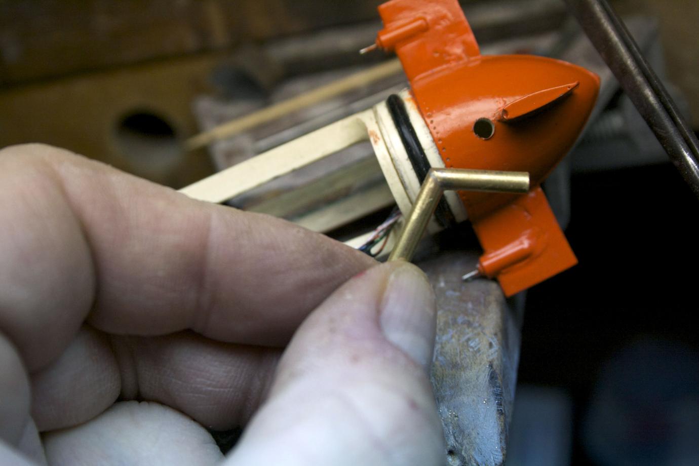 The water for the ballast system needs a way in. Took a brass pipe and sliced it so I could reconnect it with an angle and drilled a hole at the bottom of the sub.
