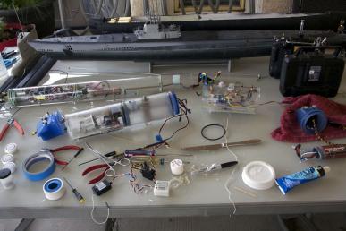 Cleaned up one end (electronics end) and installed an o-ring. Changed RX to 75MHz (wFly) and emergency blow for ballast tank. Tested for leaks and there were none. There are two servos wired together in the bow for torpedoes - might need to get that to work (my son says definitely need to get that to work).