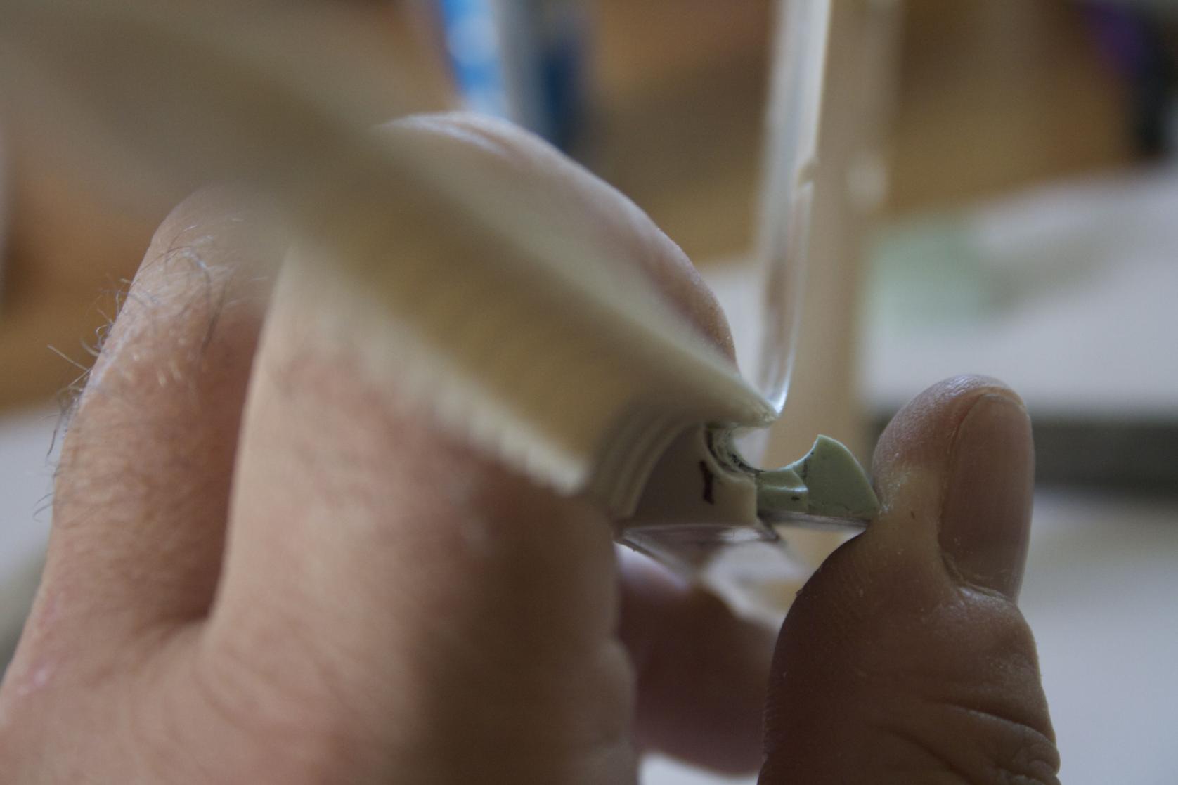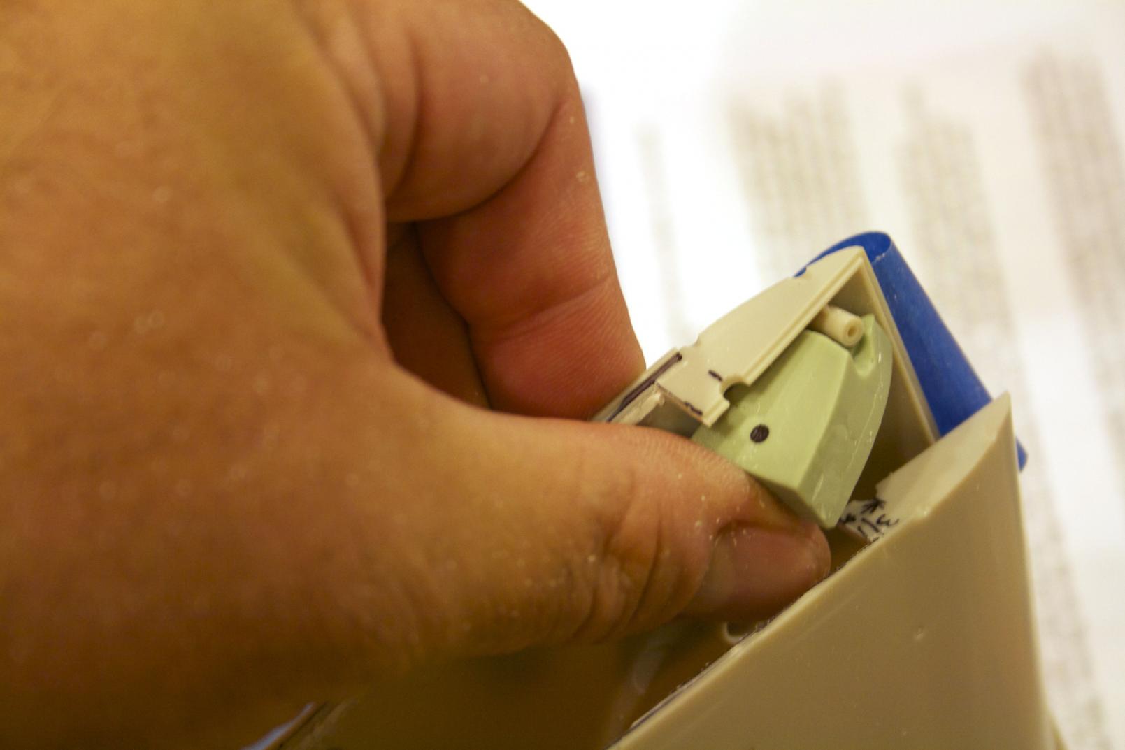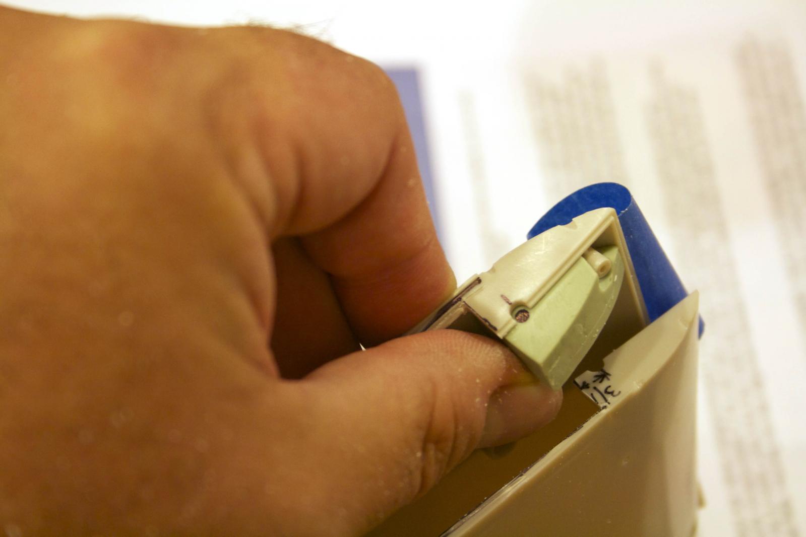 Gluing my plugs in, I used Plastruct liquid glue. It melts the plastics together (cohesive) and once dry your piece becomes one with the hull. Once dry, trim and sand.