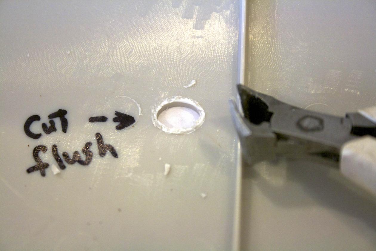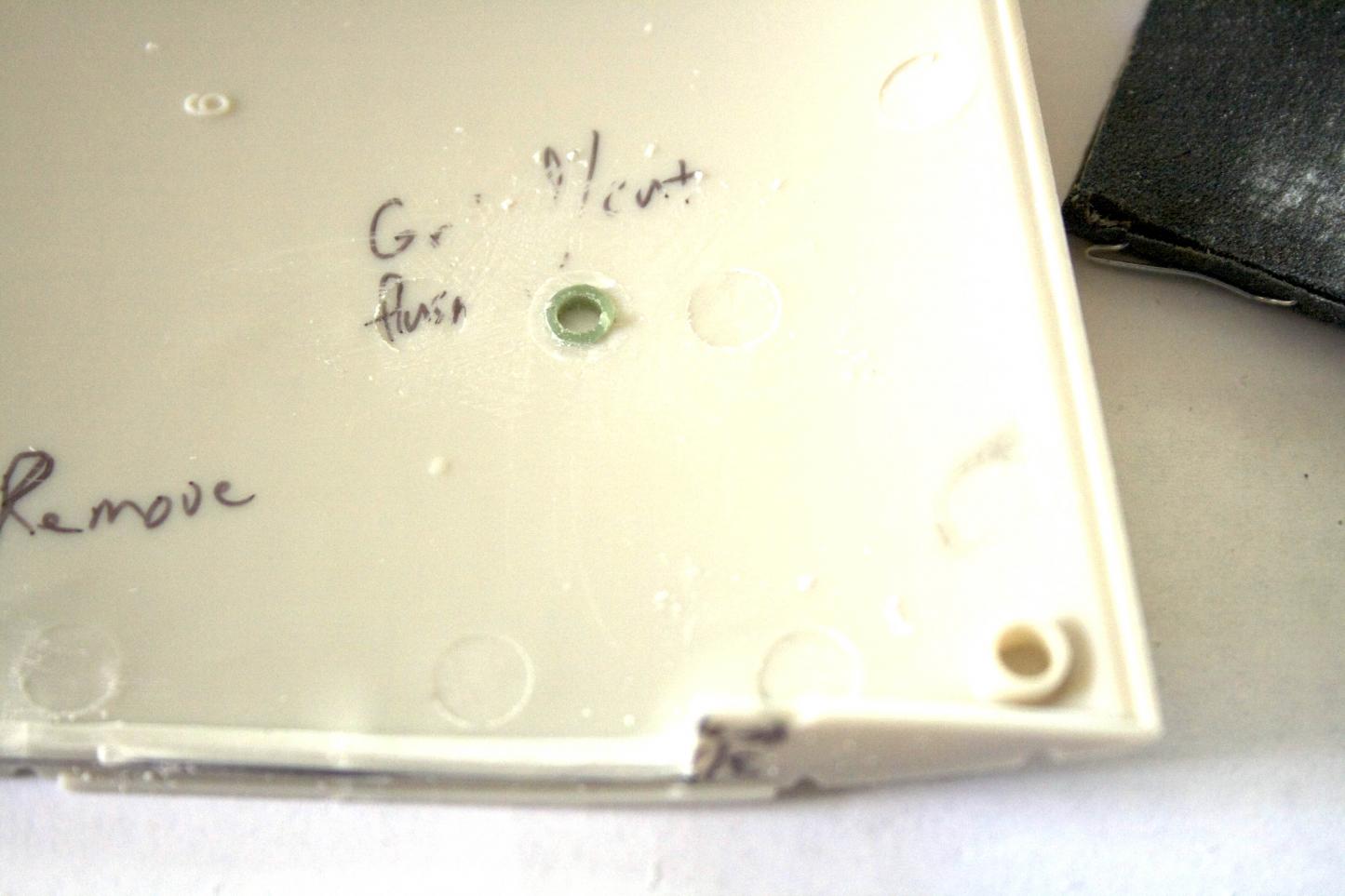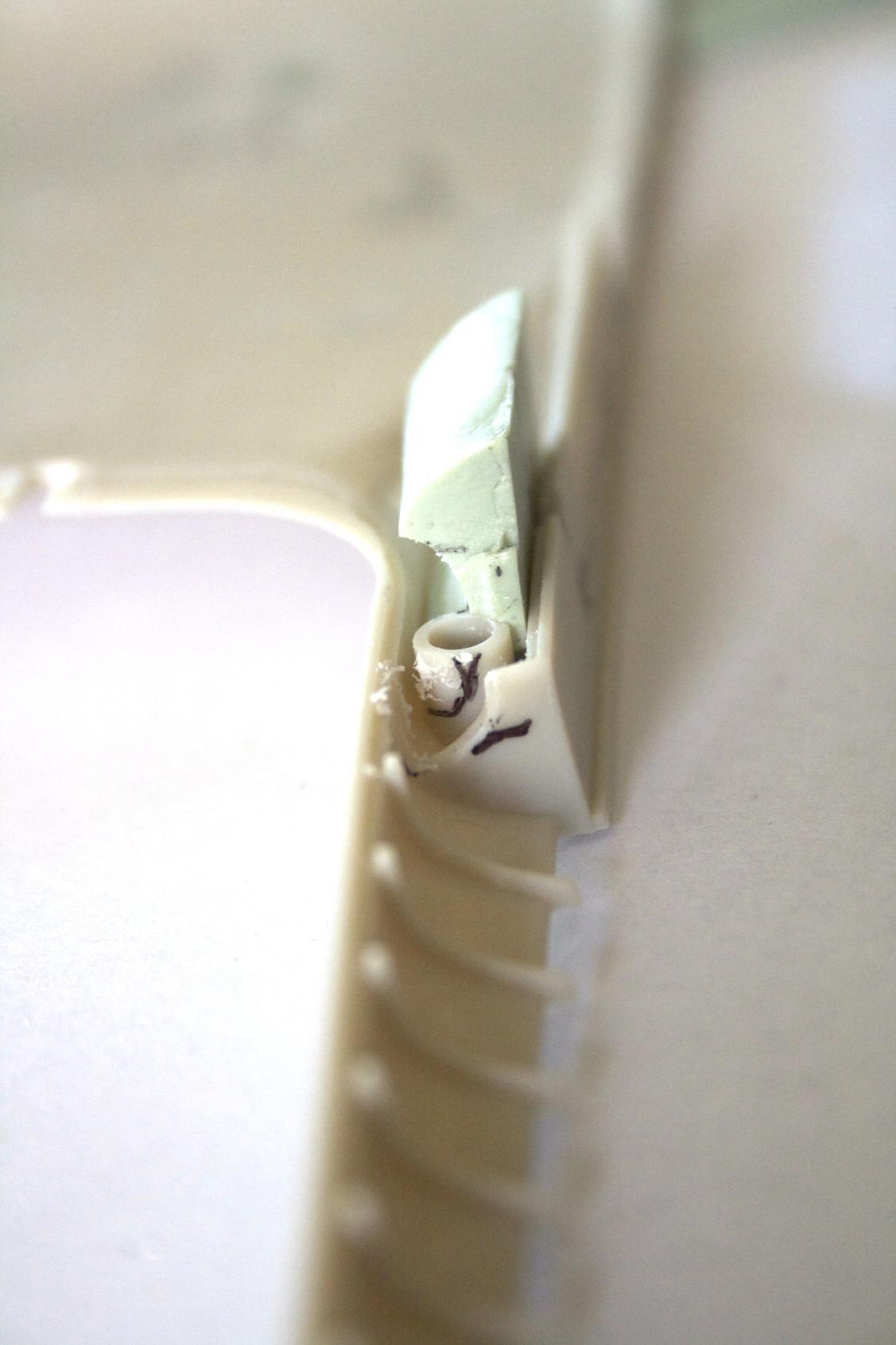 Gluing my plugs in, I used Plastruct liquid glue. It melts the plastics together (cohesive) and once dry your piece becomes one with the hull. Once dry, trim and sand.