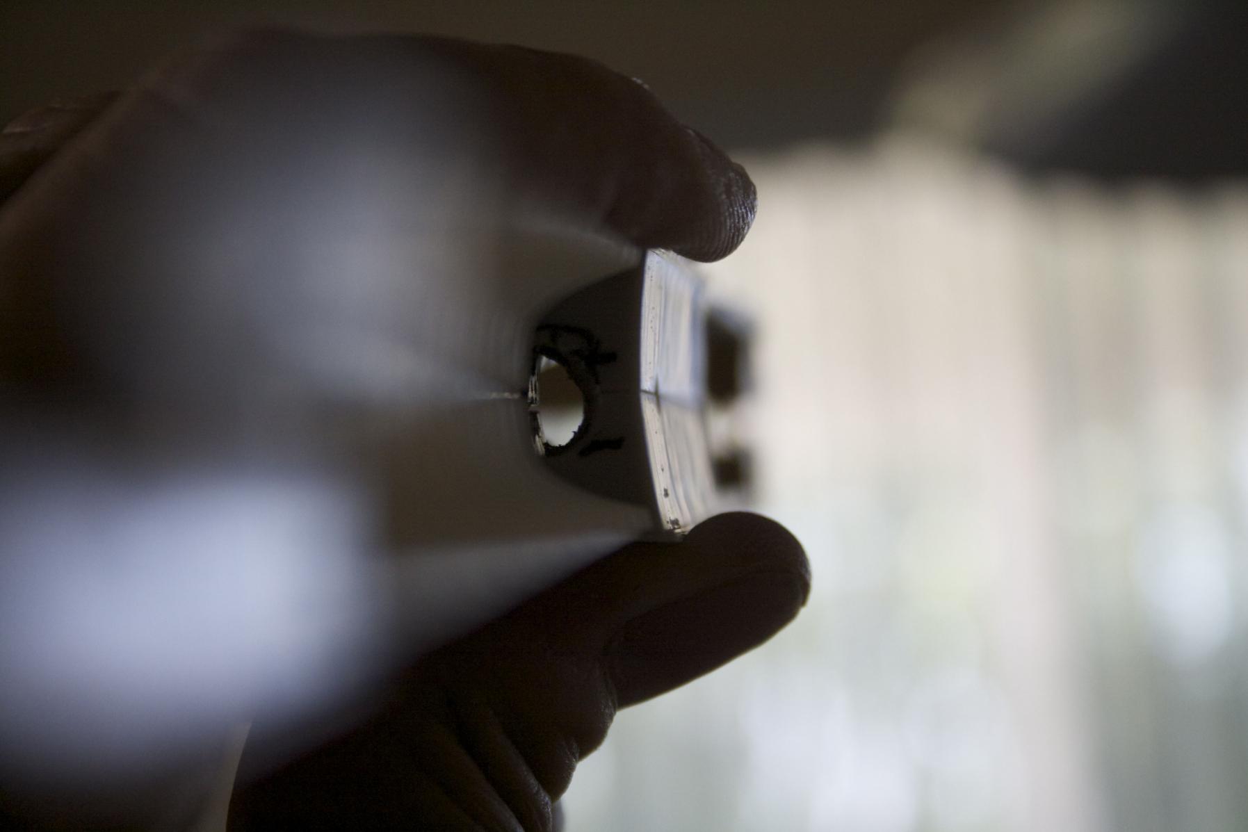 Pull the sandpaper along the length of brass tube. For the sail, the grooves that were cut into the tube spanned the distance of both bushings.