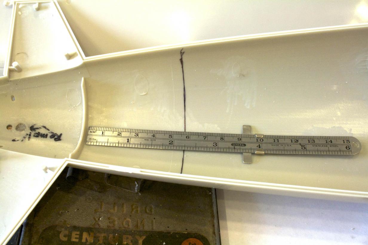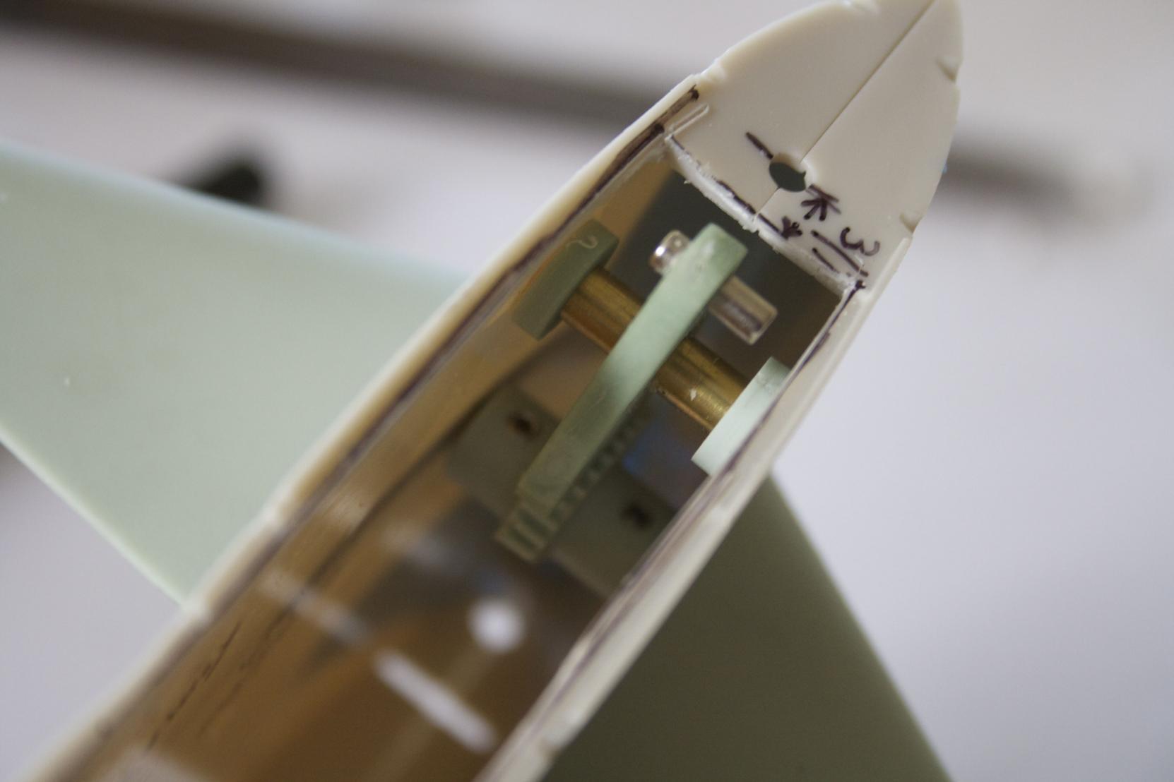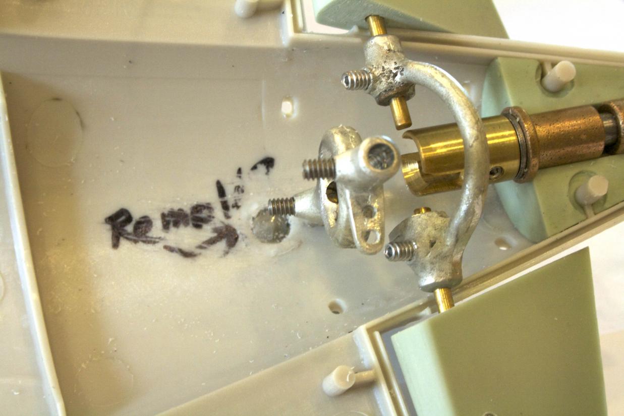 Drilled out the new rudder holes per the instructions and temporarily put in the hardware to test it out. The arch in my rear dive planes yolk was bent out of shape making the plane have a funny dihedral in it. Since the metal is soft, gently pulled it until everything lined up.