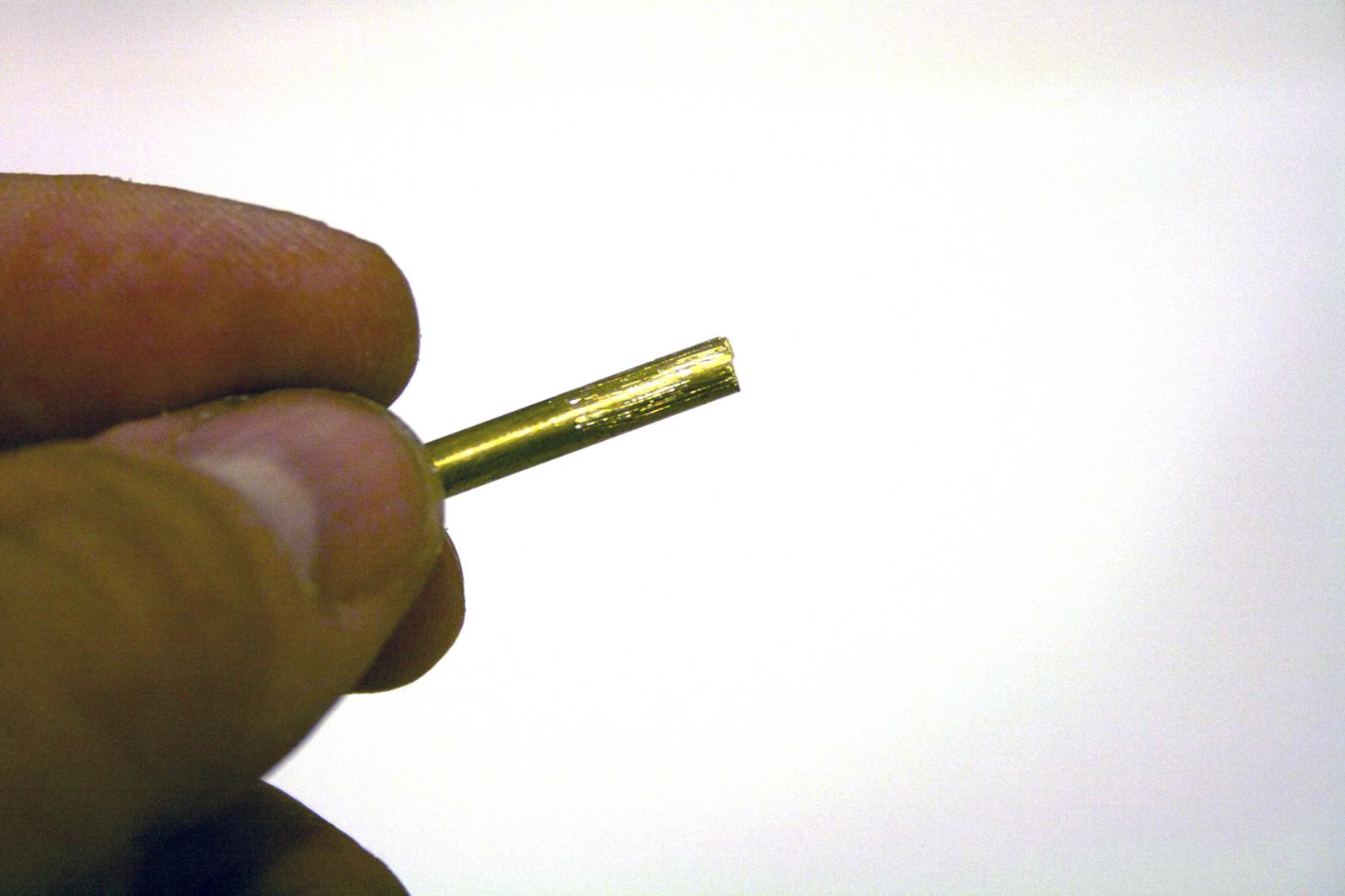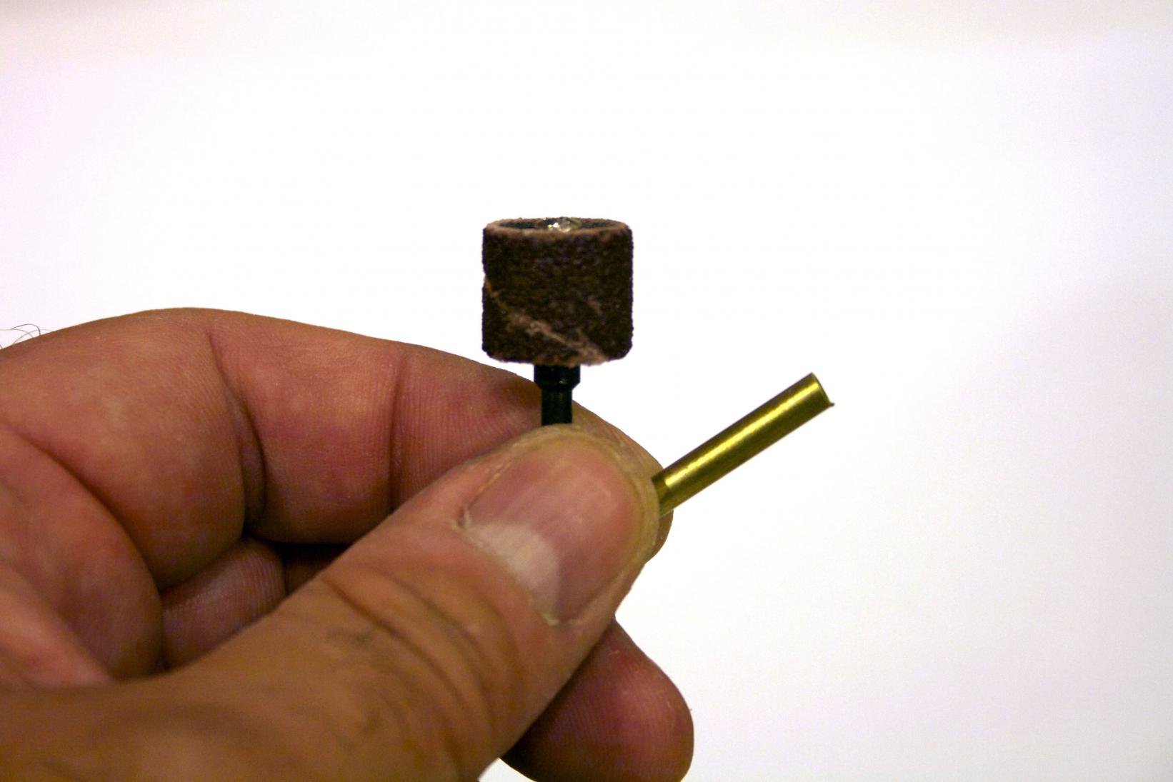 I took a piece of 1/8” brass tube and using the coarsest grit paper (this sanding drum was in front of me), you could use a file or a concrete wall for that matter.