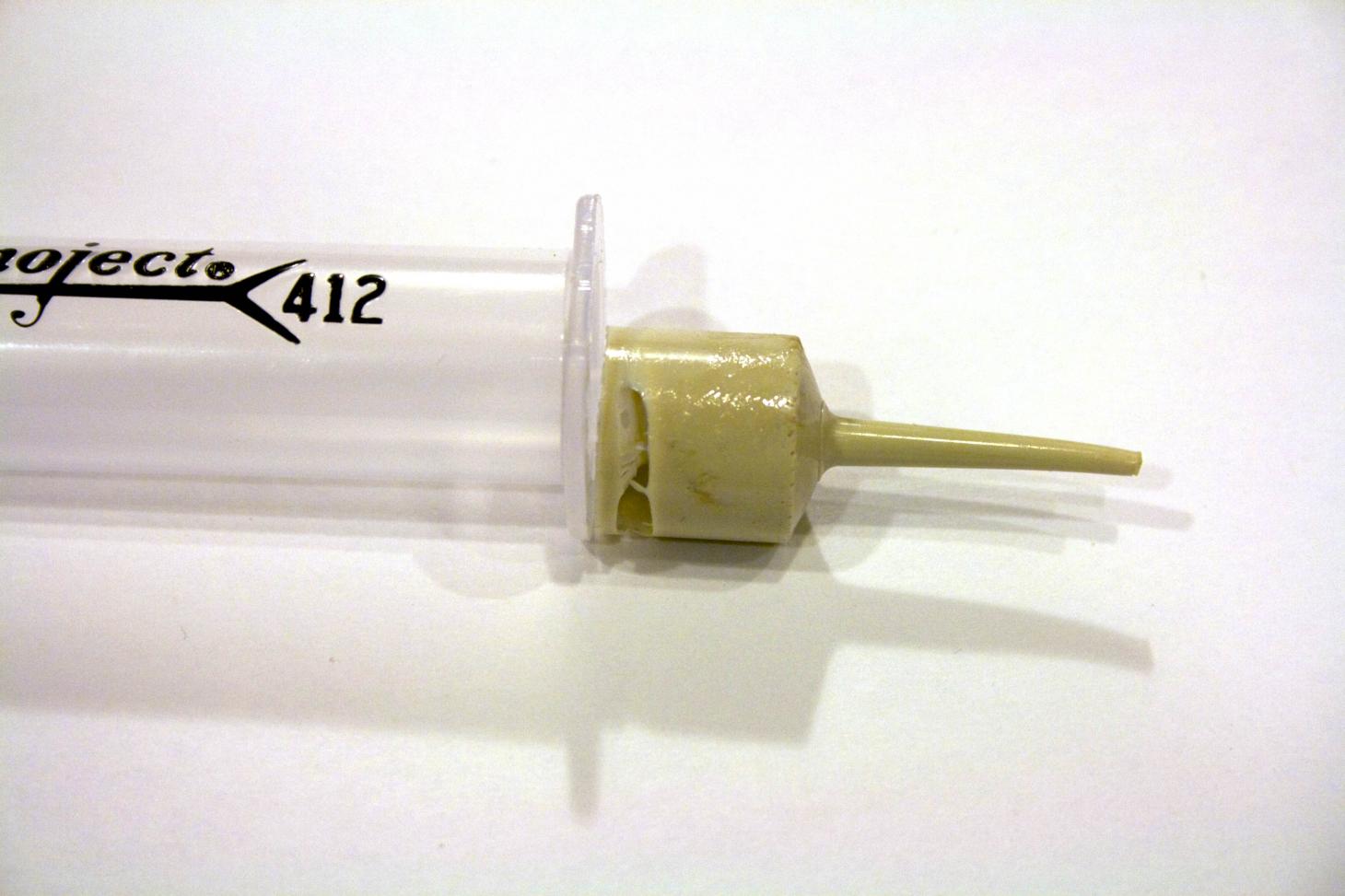 To fill the mold made from the master, I used a syringe. Then I thought what if I left the extra resin in there (since I made too much). The resin does not seem to permanently stick to the plastic in the syringe.