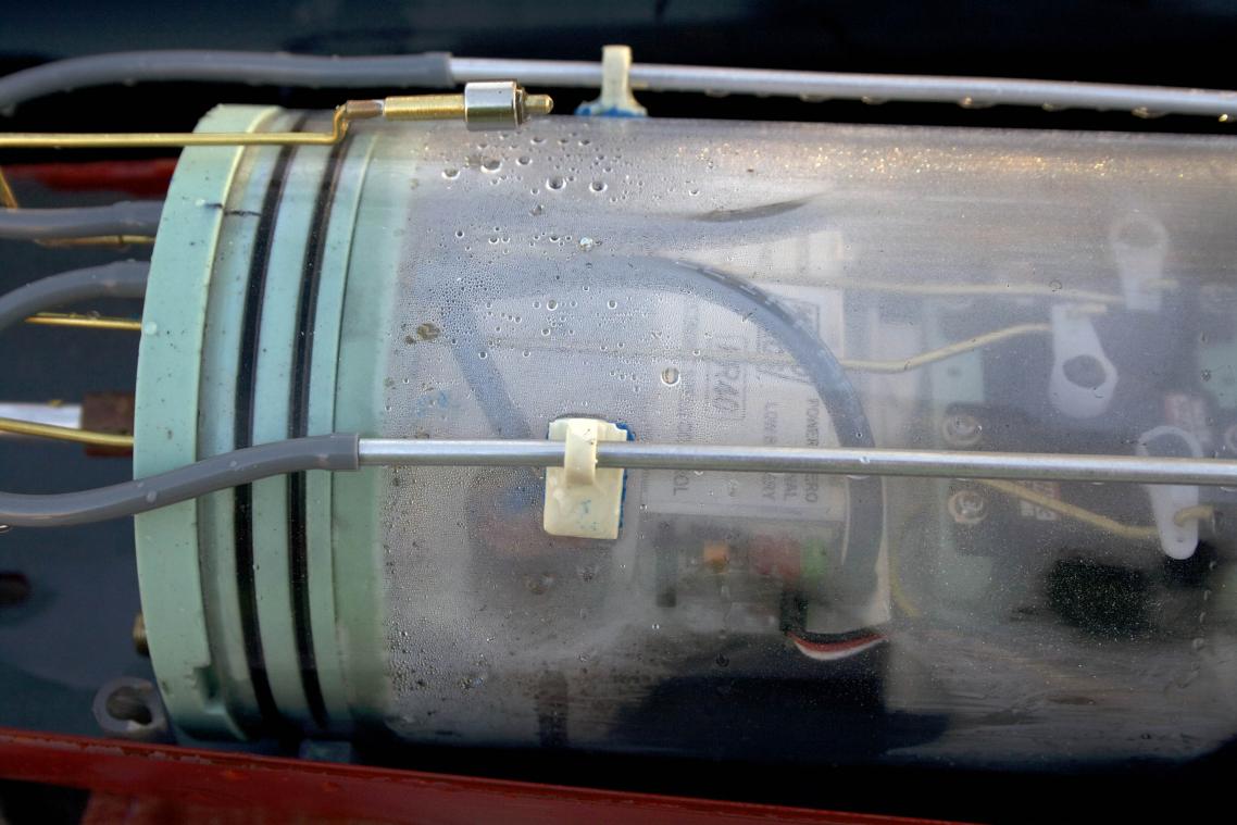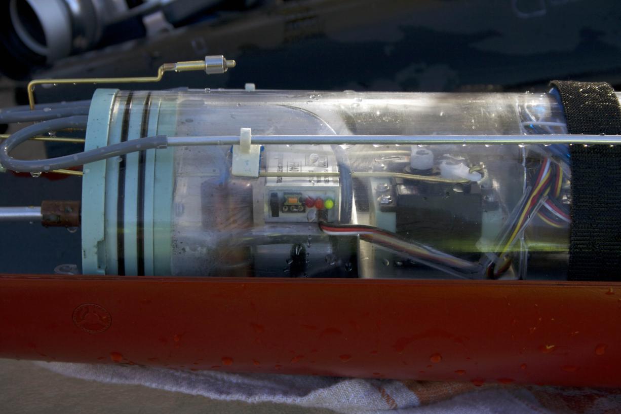 After about 45 minutes, the sub was running with the aft end down. This time the cylinder condensation/spray was noticeably greater with a small amount of water at the bottom. The reservoir was drained by blocking the air intake forcing. Some water came out (it did work), but not a tremendous amount of water came out. Indicating to me that the water was not entirely from the SAS.