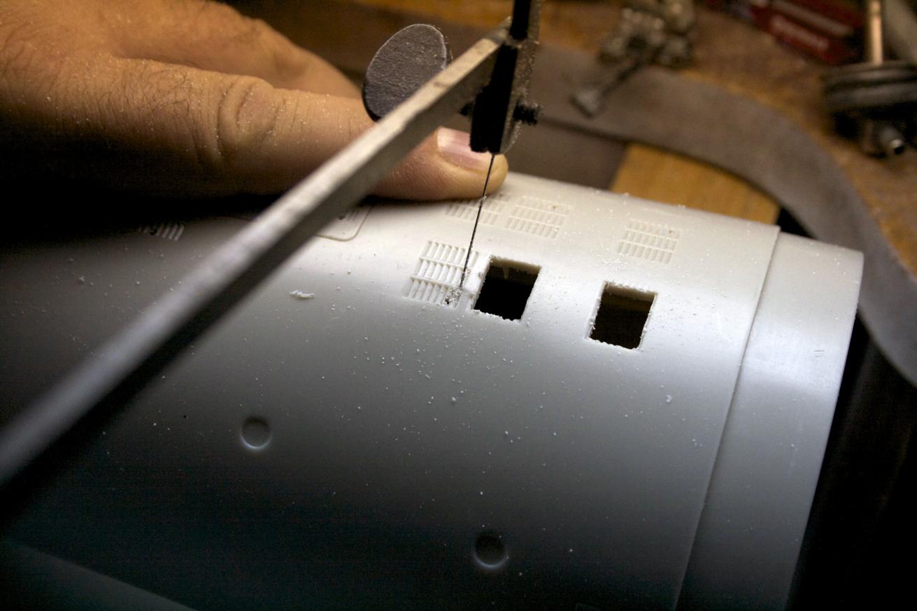 Drilled a hole for the blade to get through. Using a deep throat jewelers saw (coping saw) and a fine blade rough cut the openings.