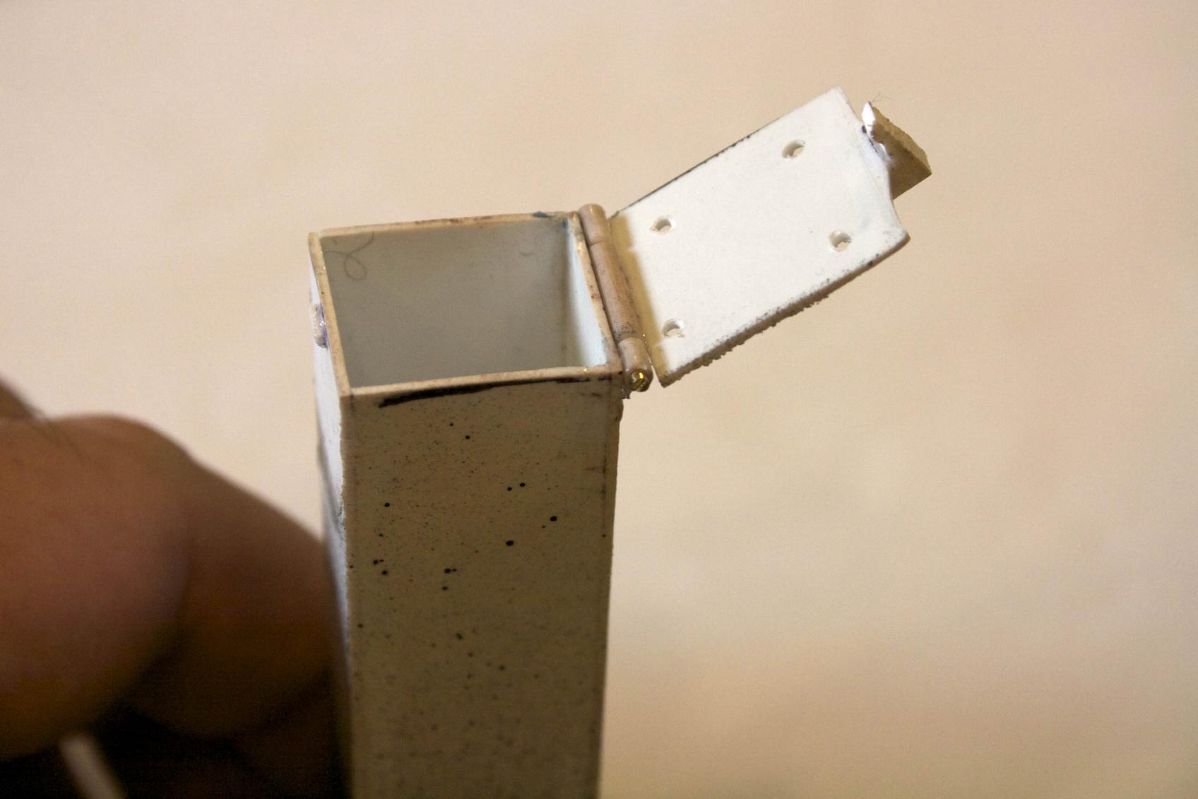 Made a hinge and snap latch. Painted the top most surface black. The entire contraption is 7.5 grams which if I did my math to about .46 cubic inch of ballast. Please correct me if I got this wrong. Trying to understand the technical aspect better.
