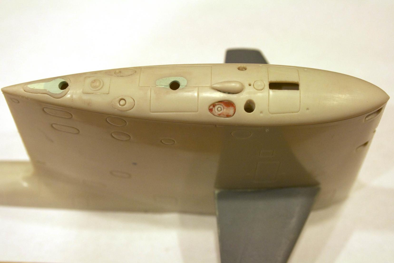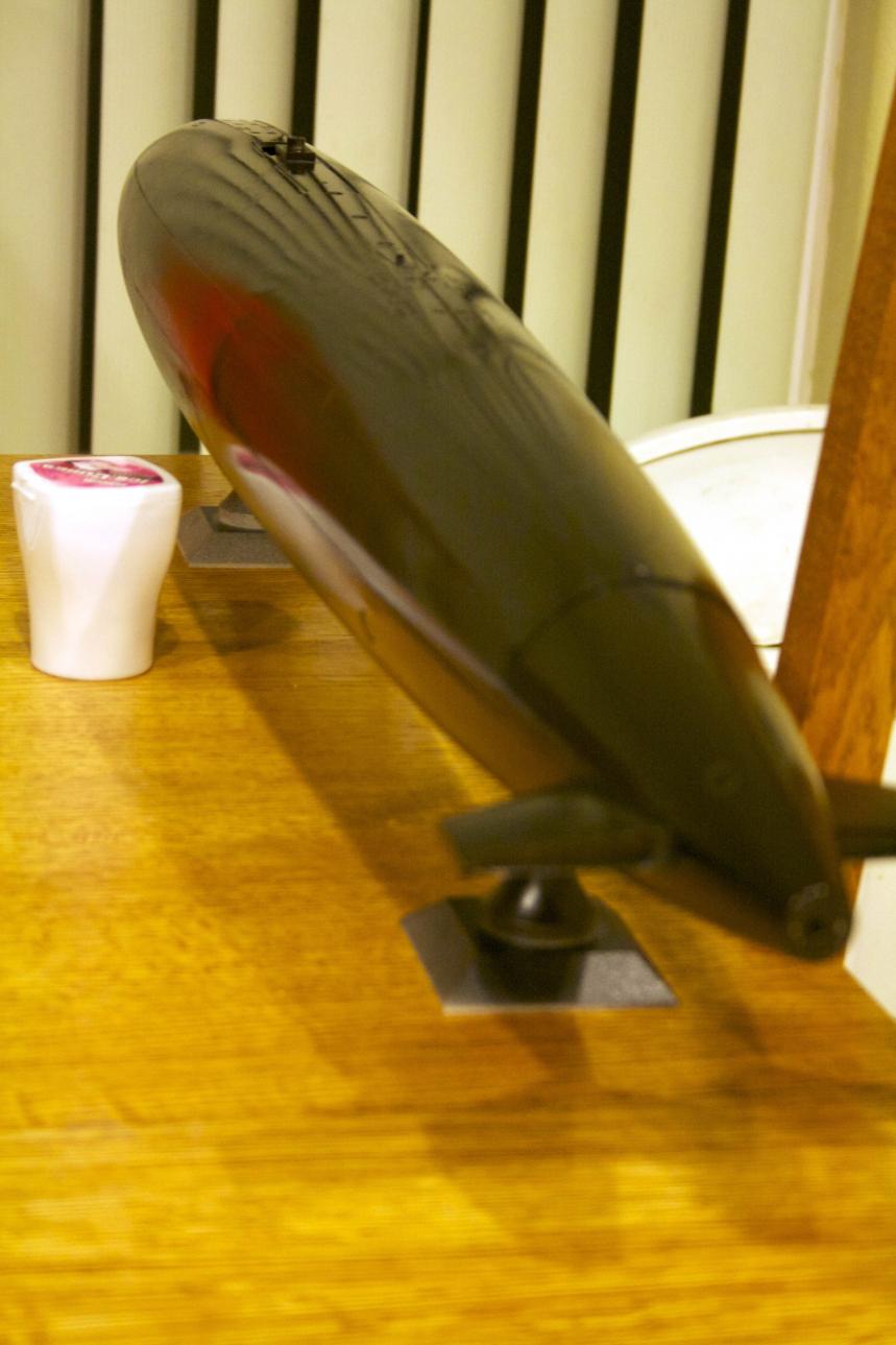 Primer and coat of paint is applied. There are some areas on the sail and planes that I got some orange peel. The entire finish on the sub will get a wet sanding at 600 grit and another coat of paint. The gloss finish will disappear after decals are placed on. Not sure if I will finish the paint coats or decals now or after sub-driver install and trimming.