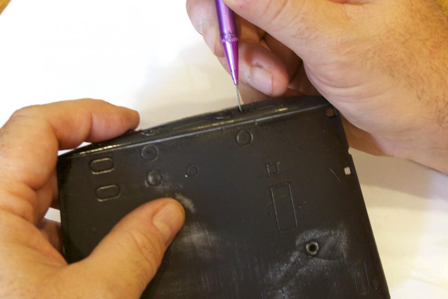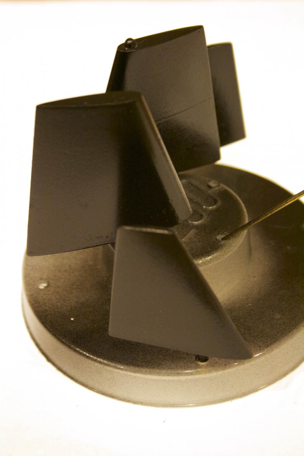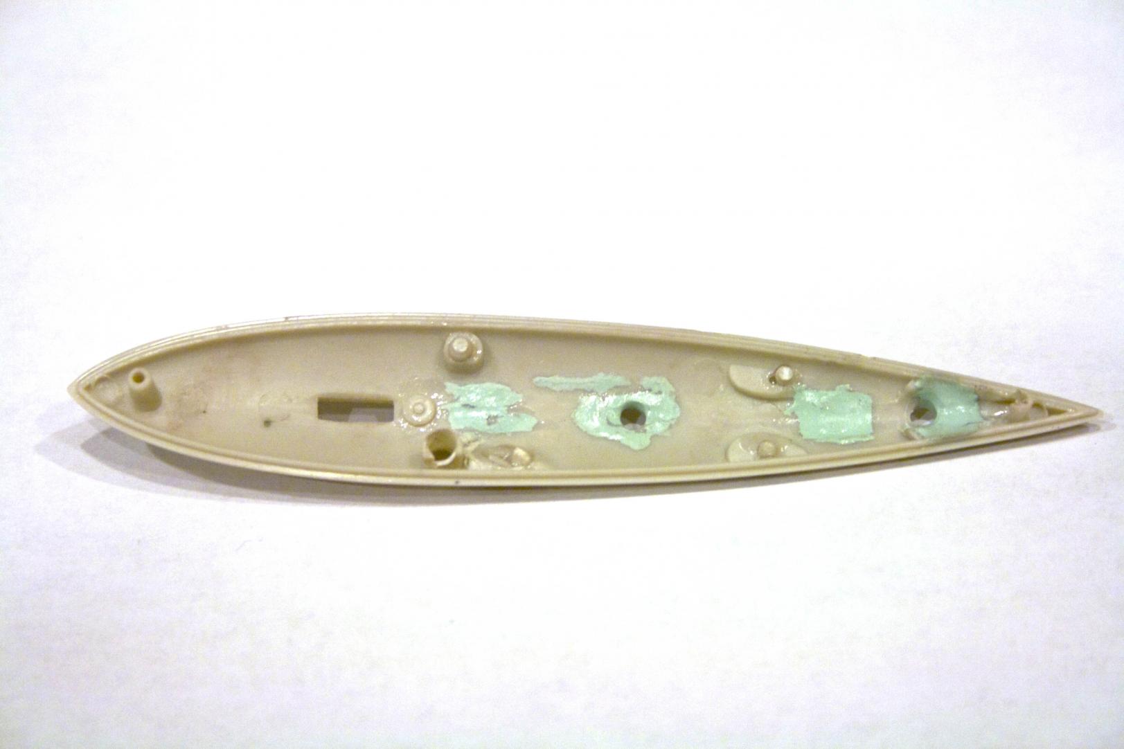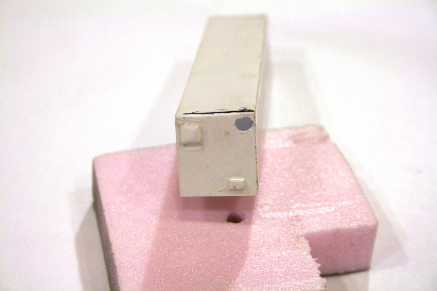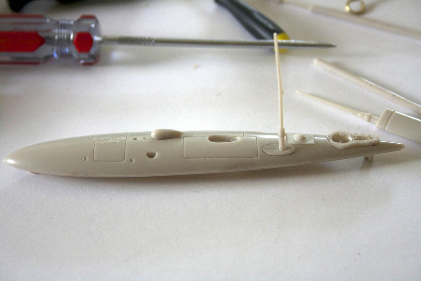 The rectangle tub was capped off. Placing the styrene unit in the sail and using a mechanical pencil (with the lead extended a lot), marked where the scope should be. Drilled out the hole to allow the scope to rise. The other squares are holes sealed off after experimenting (larger, smaller than no hole) and found that they were not necessary. The hole the periscope rises in was filed to allow smooth motion doing so made it slightly oval.