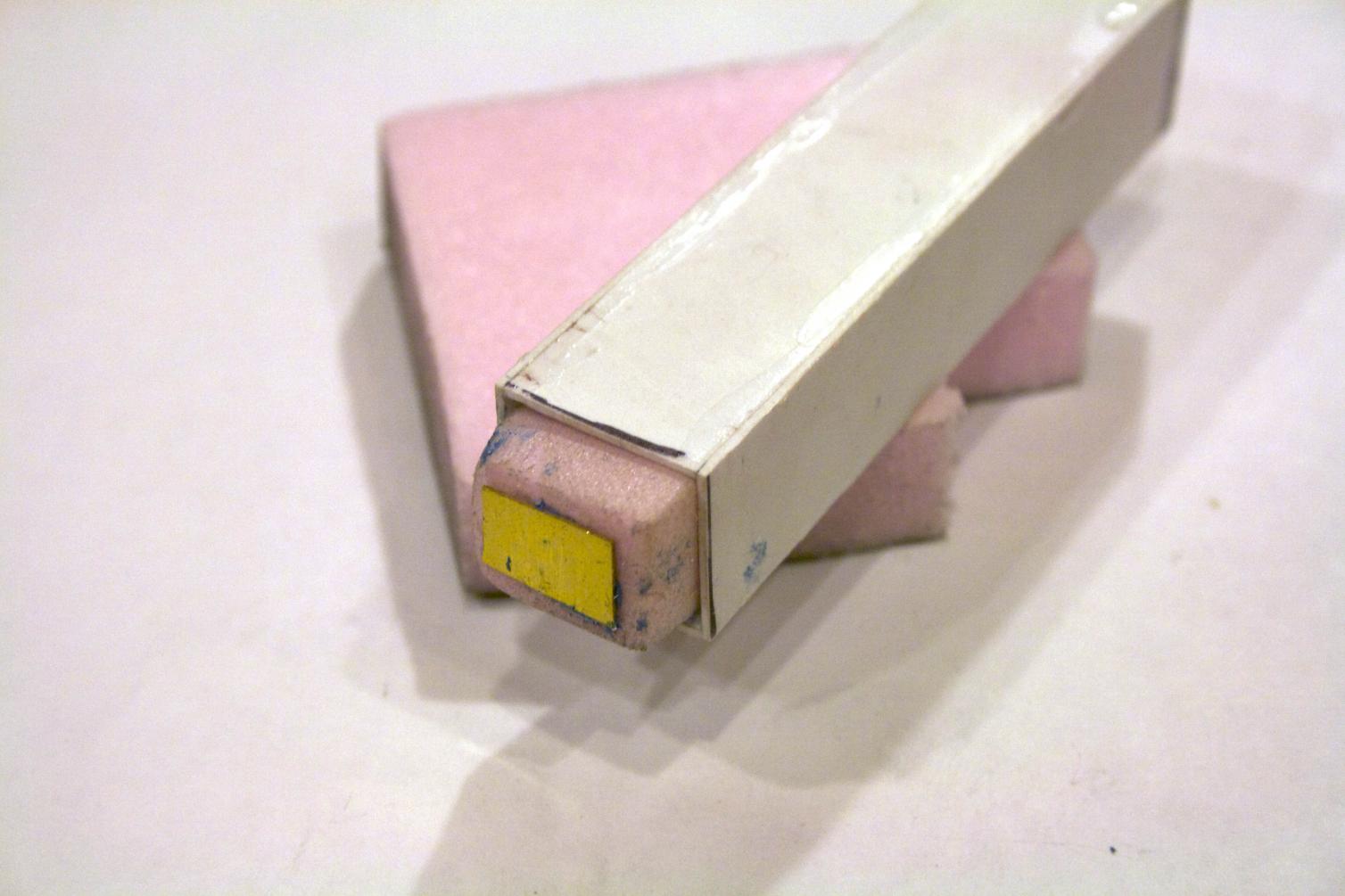 More on the periscope. Made a rectangle tube from styrene, 18mm x 20mm x 87mm. Taking the foam that the propellor came on, cut a block out and shaved to fit.