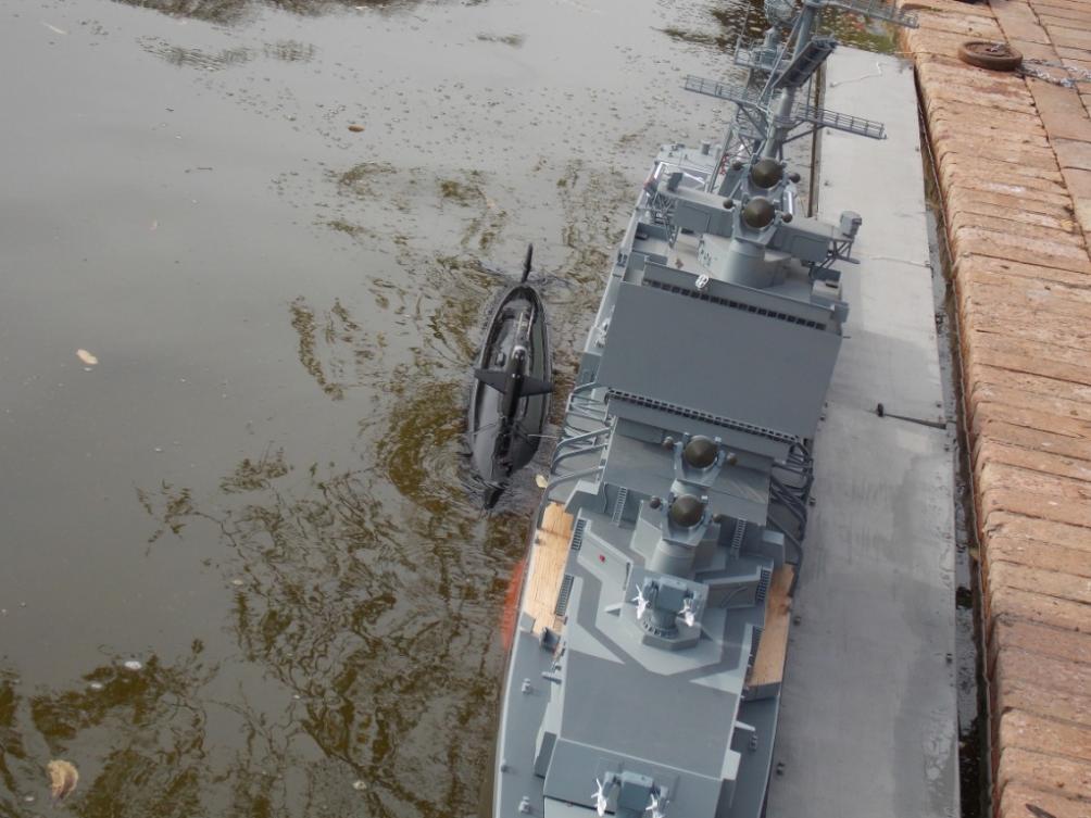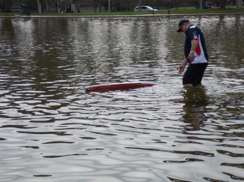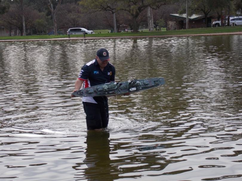 But I didn't have the worst day at the Pond !! Clubmate Jim's Daring class HMAS Vampire and Brenton's River class HMAS Parramatta had an "Incident" resulting in Vampire being rolled over on her side and Vince wading out for recovery!! SEE PIX!!
