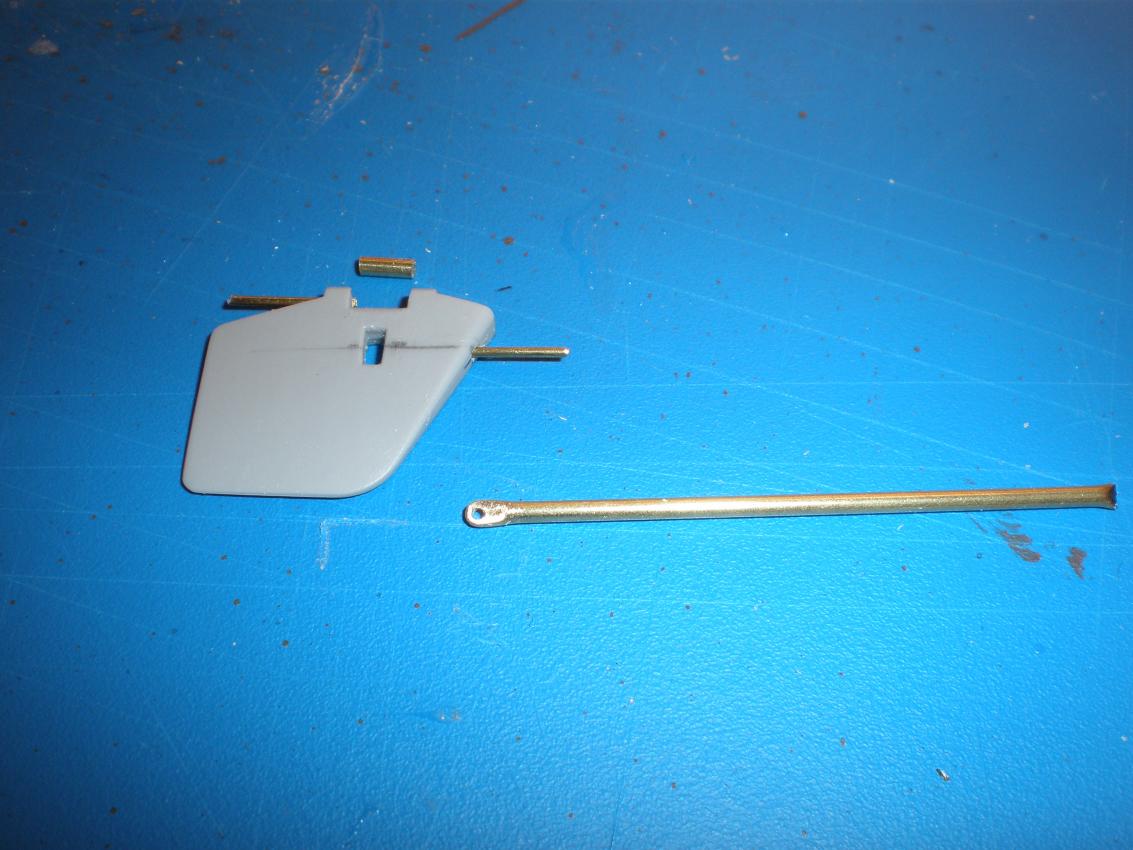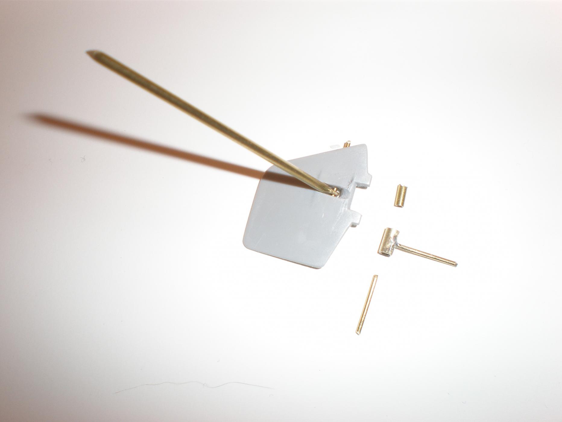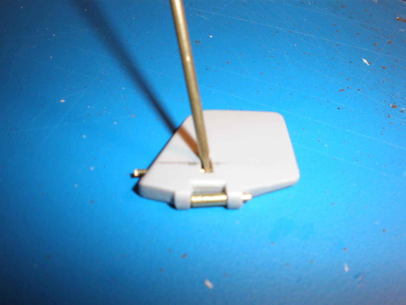 The hull end was drilled out to accept another 1/32" pin. It, in turn, will hold that little piece of 1/16" brass tubing upon which the planes will hinge