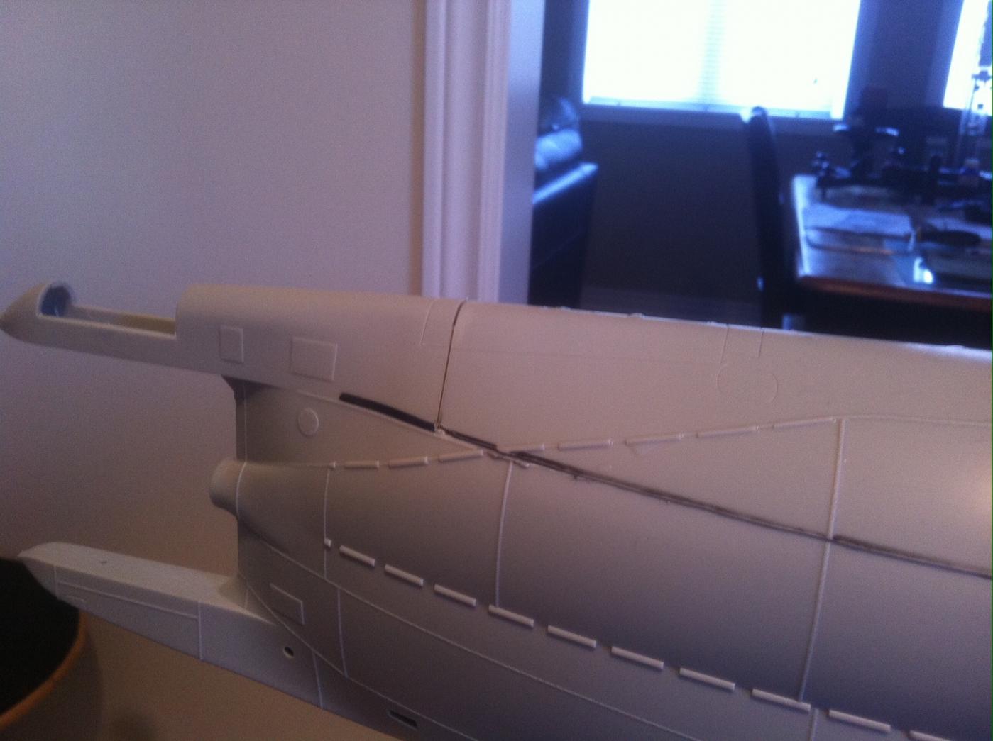 The indexing tabs get in the way -- make up the lost kerf now, the task will be much easier without having to dodge the knife, file, and sanding blocks as your restore a flat to the edges. Add the indexing tabs only after you have a tight, even break between the assembled upper and lower hull pieces.