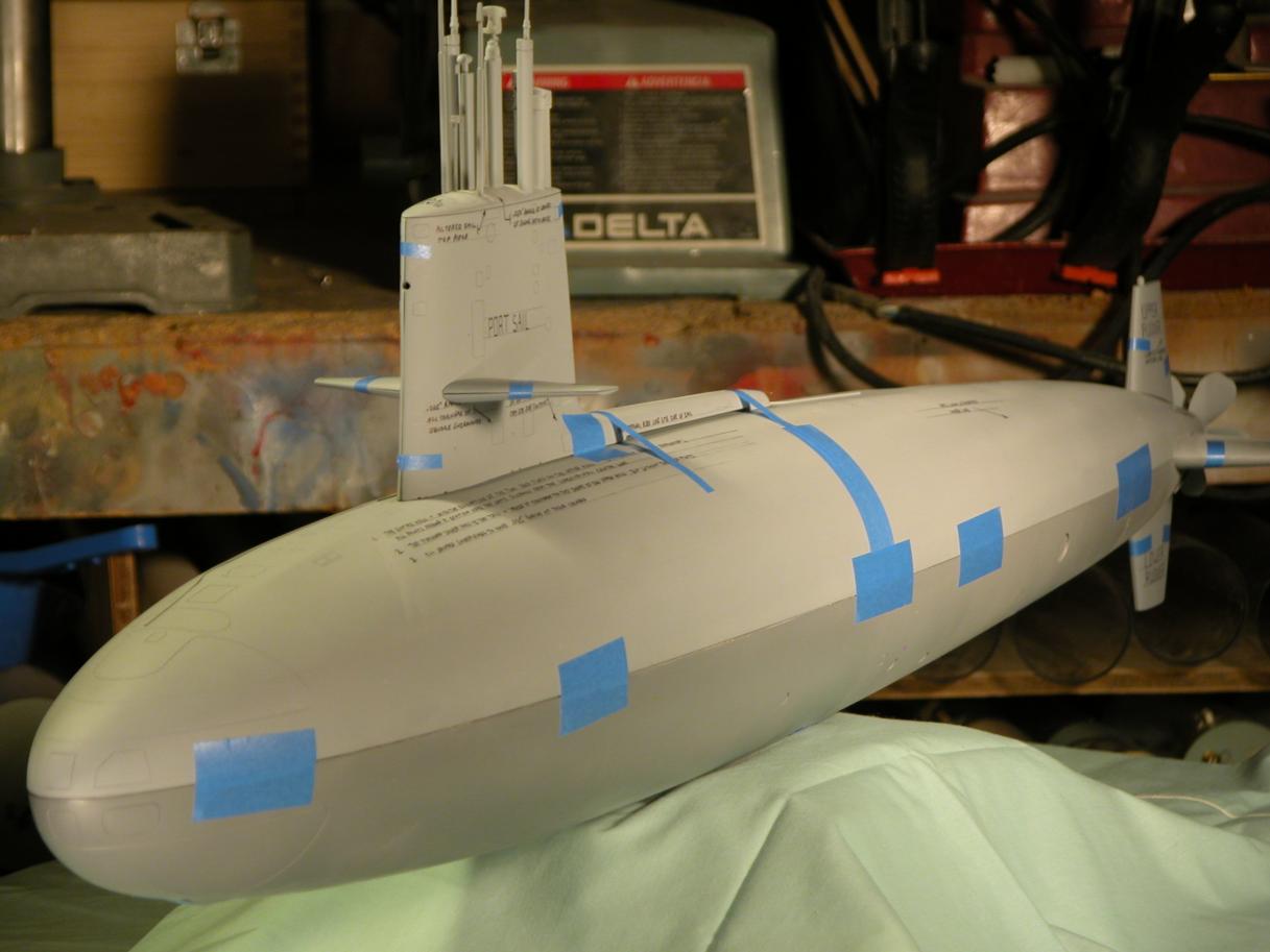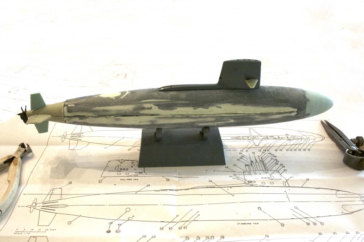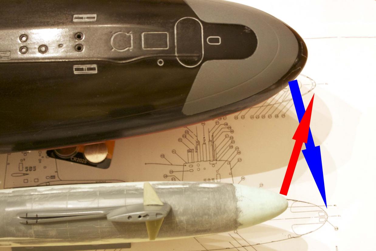 There was something bothering me about the new bow on the little Skipjack, it seemed to be too pointy. This is especially apparent when it was compared to the 1/72 version of the same sub.