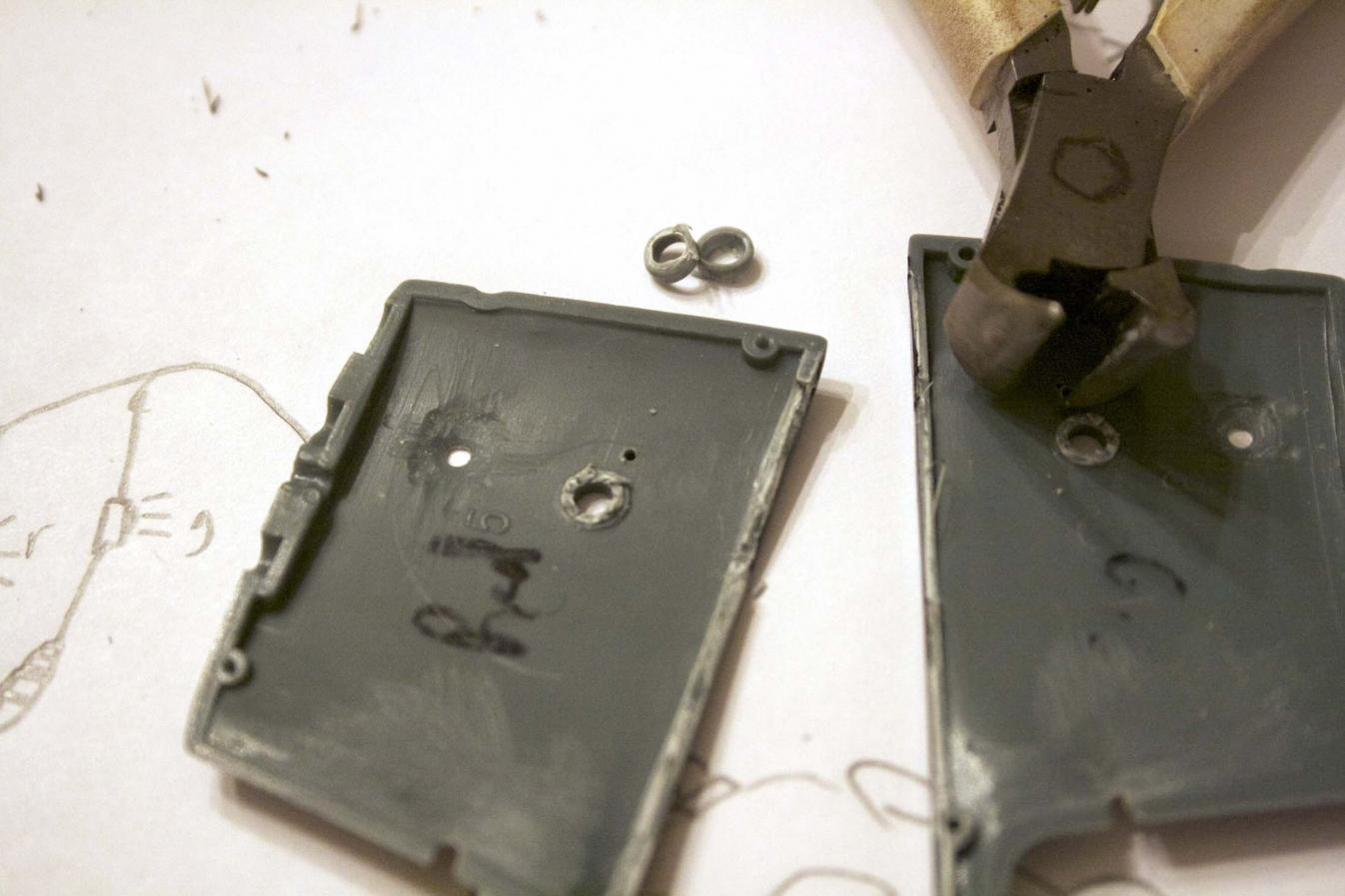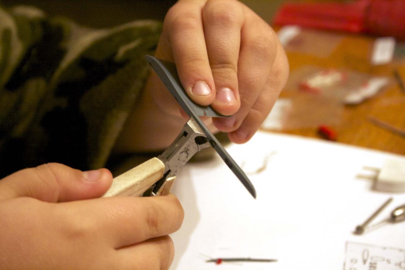 Doing the same thing to the sail planes, used the wire to make the holes fit the brass. Once pressed together the wire was too long. We measured the distance and clipped the extra wire off.