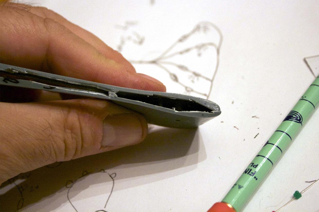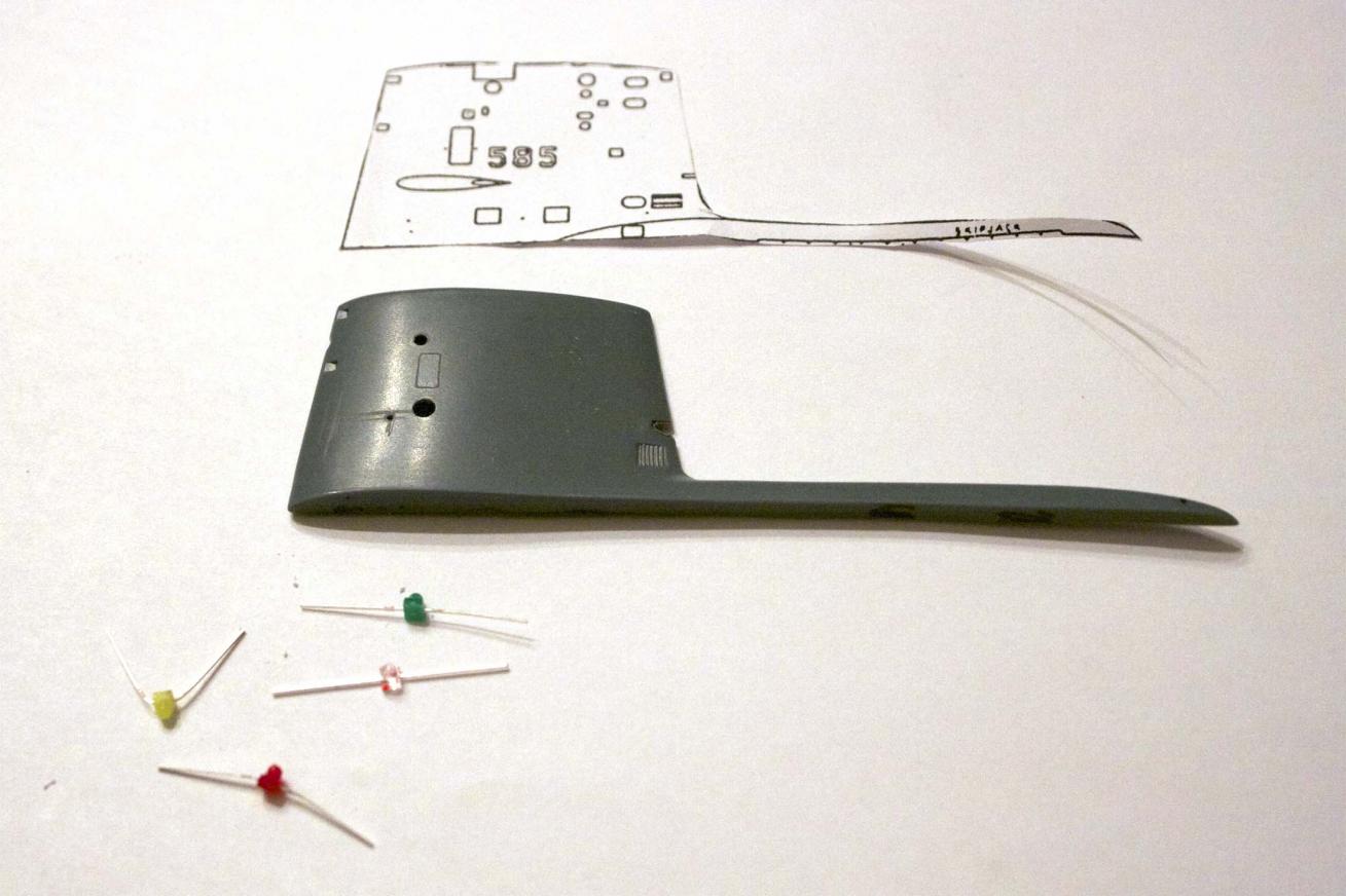 The next step is to paint the interior of the sail to block light from glowing through and making the sail look like a reject from Close Encounters of the Third Kind and fill the side holes from the original kit. We will need to solder up all the connections, open the hull top for running wires, epoxy, insulate, and seal the wires to prevent corrosion.