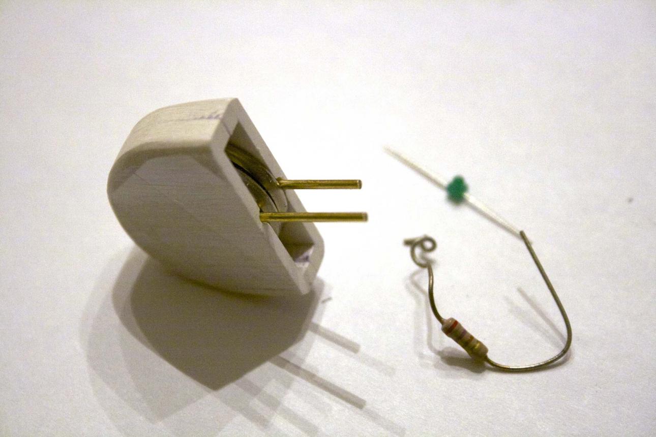 Now comes the LED demonstration to Sam. The battery holder has a groove cut on each side. In those grooves are a length of brass rod/wire. Using a right sized resistor, Sam and I played with the LEDs.