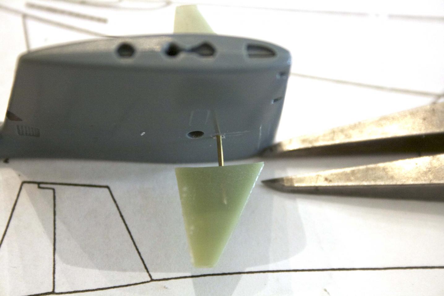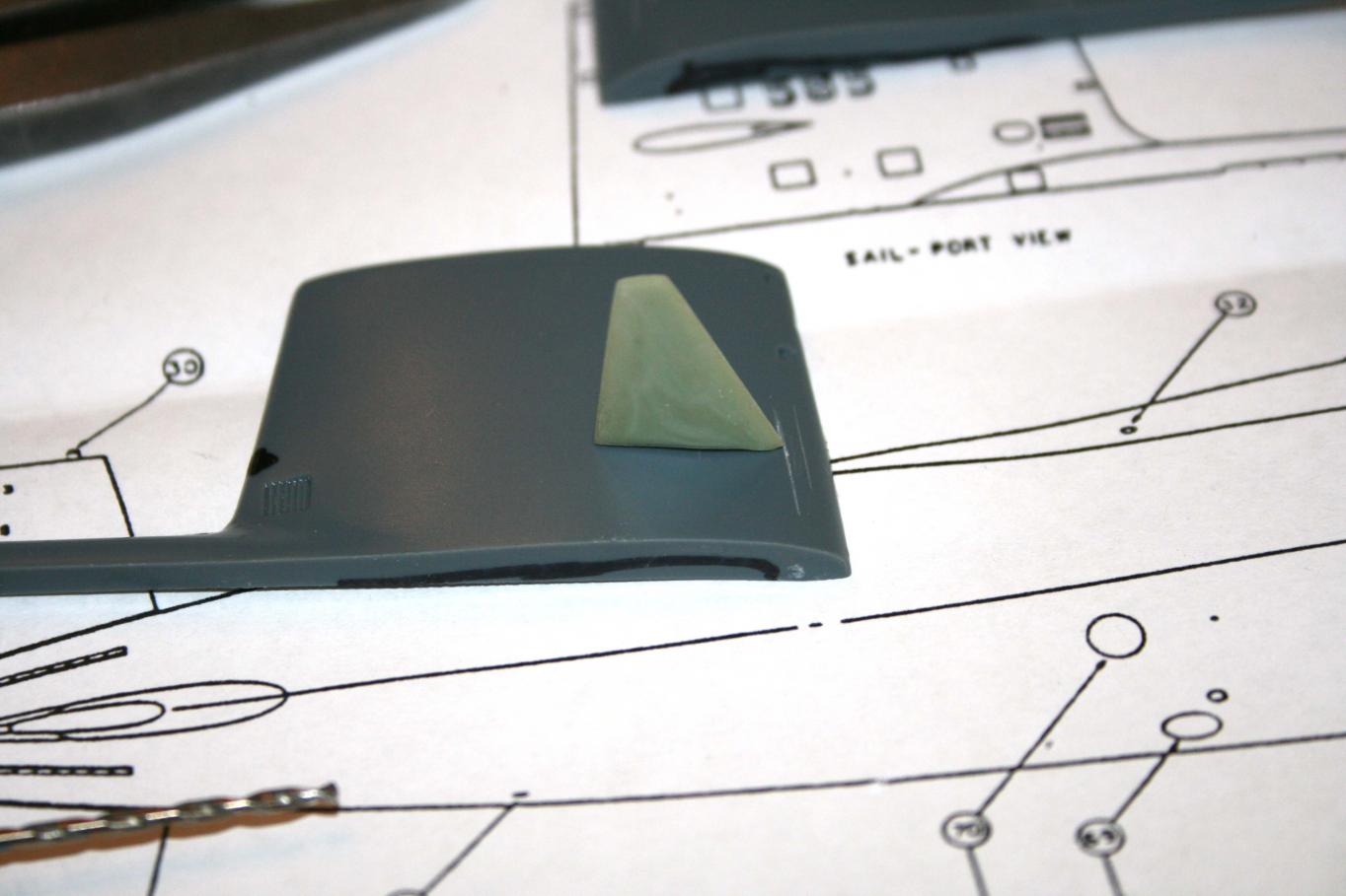 Using the plans included in the fittings kit, we figured out where the sail plane would be (a lot more forward than the model's location). Measured from the tip of the sail plane to the center of the hole in the plane and transferred that distance to the sail. Once everything was marked and checked, drilled with a .020" hole (it is a much smaller hole that the brass strip included in the fittings kit).