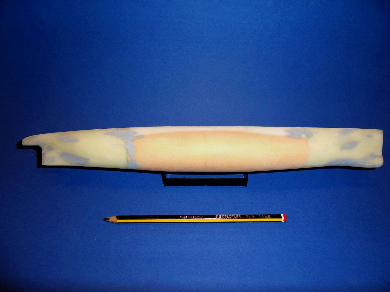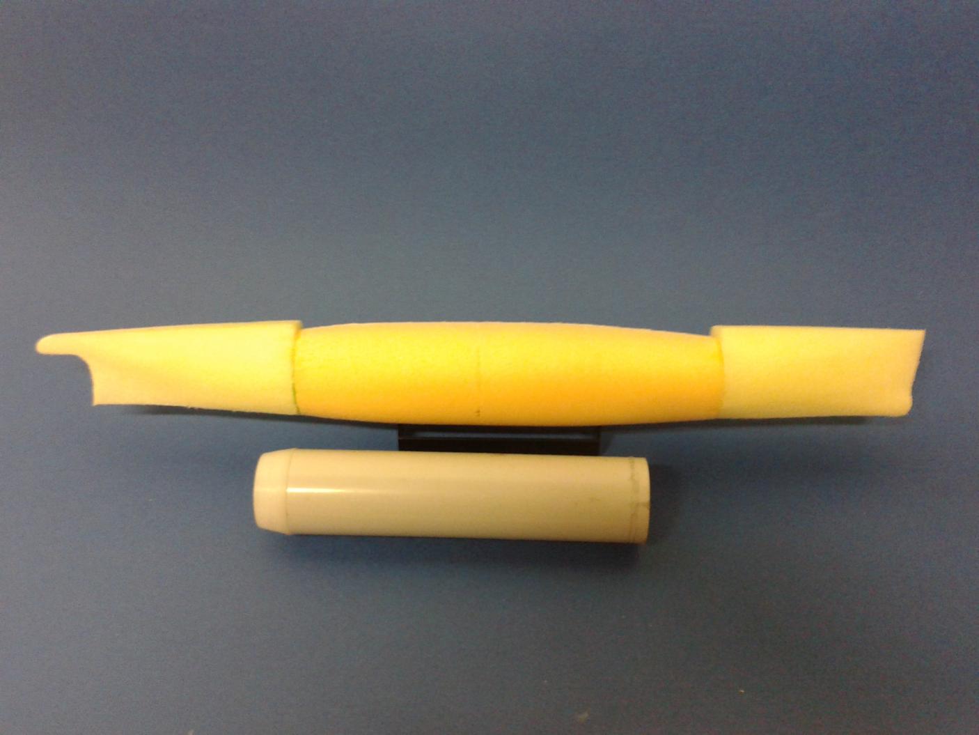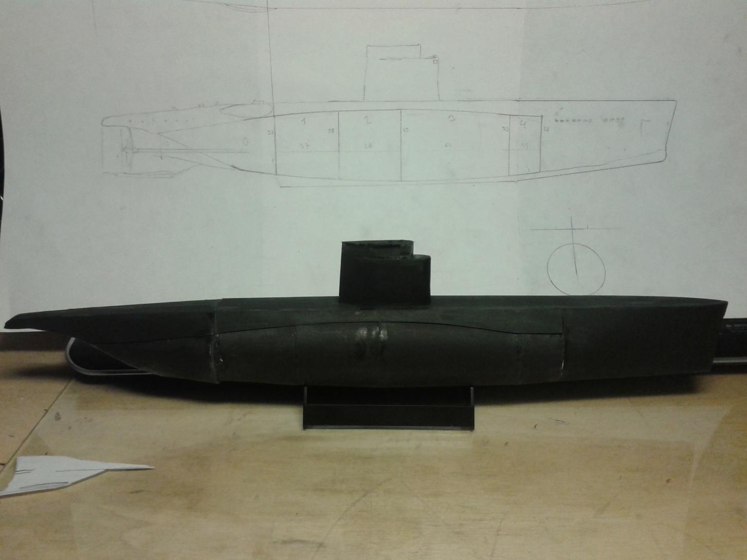 With this model I would like to test the appearance and dynamic properties of a cartoonized sub, strenght of an epoxy impregnated cardstock outer hull, micro piston tank and magnetic actuator for rudder control.